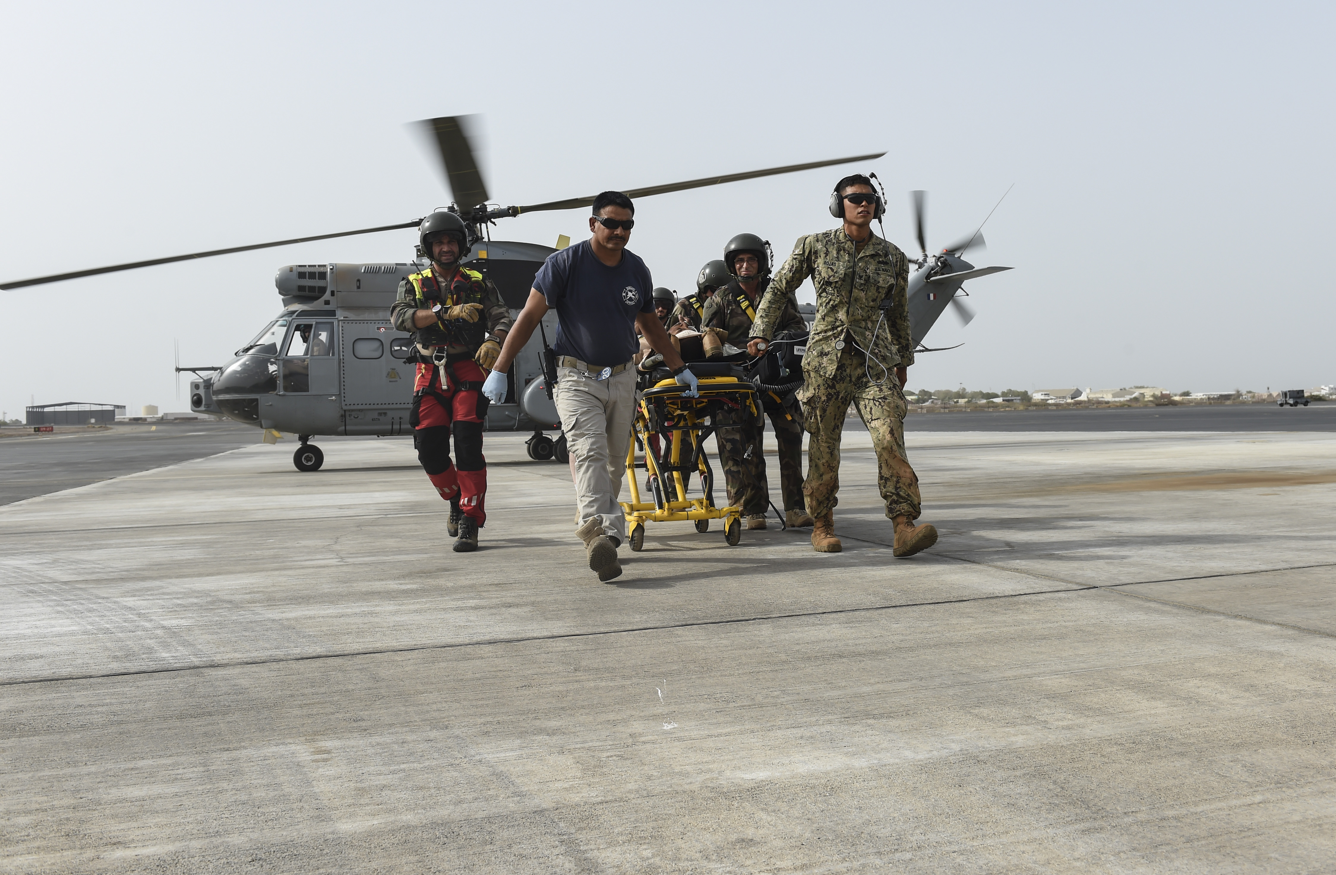 U.S. Navy Hospital Corpsman 3rd Class David Rojas from the Naval Mobile Construction Battalion One, a maneuver unit of the Combined Joint Task Force-Horn of Africa, along with emergency medical services personnel and members of the French Air Force Tactical Airlift Squadron 88, transport a patient from a SA 330 Puma helicopter across the flightline, during a bilateral exercise with French forces at Camp Lemonnier, July 20, 2017. CJTF-HOA partners with French counterparts to strengthen regional cooperation and interoperability, enhancing the mutual ability to conduct operations in the region. (U.S. Air Force photo by Staff Sgt. Eboni Prince)