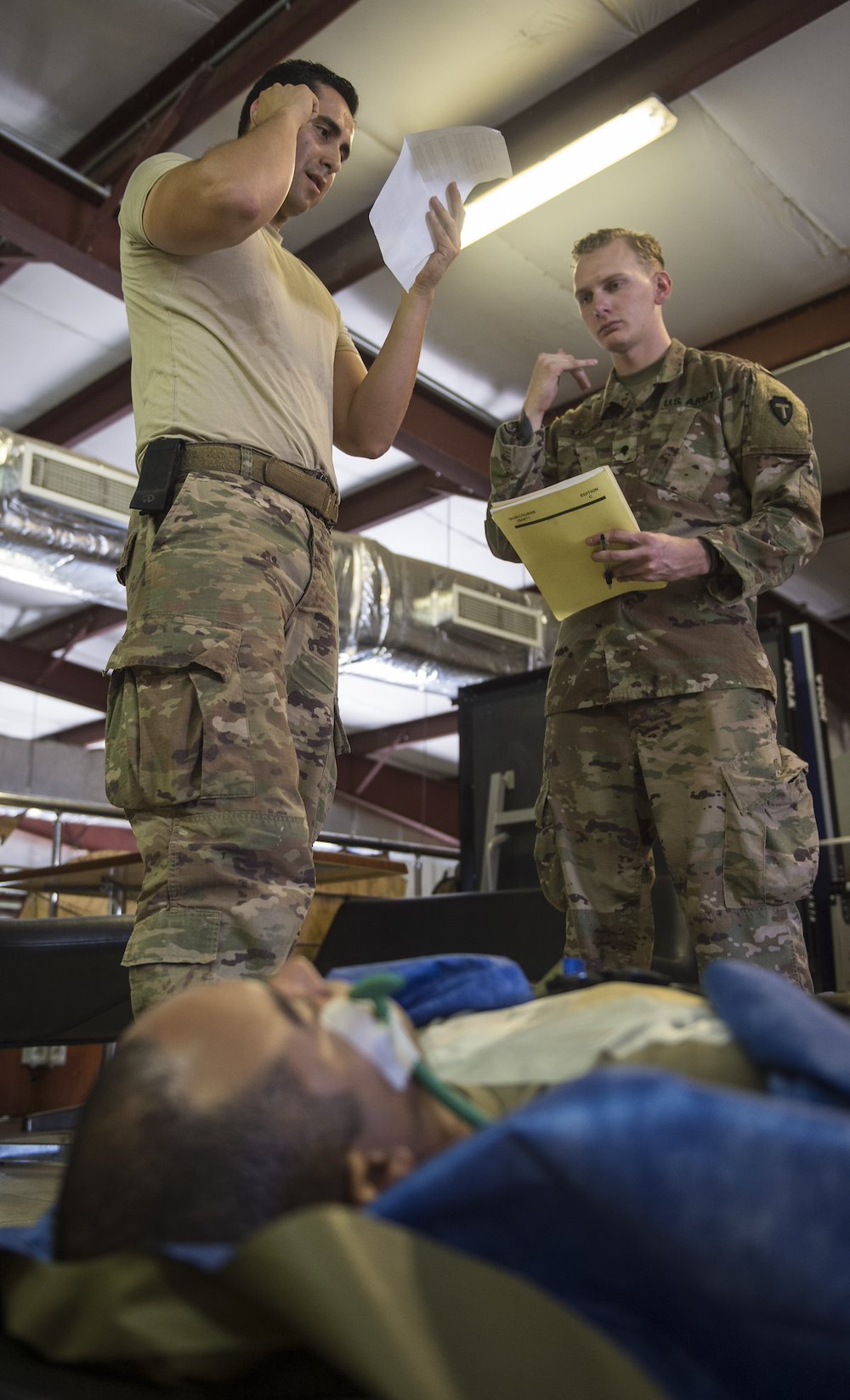 U.S. Air Force Staff Sgt. Julio Rojas (left), assigned to the 870th Aeromedical Evacuation Squadron, simulates calling for a medical evacuation as U.S. Army Spc. Alexander Kahanek, an instructor assigned to the 3rd Battalion, 144th Infantry Regiment Task Force Bayonet, attached to the Combined Joint Task Force – Horn of Africa, observes the final assessment of a U.S. Army Combat Lifesaver Course held at Camp Lemonnier, Djibouti, Dec. 1, 2017. The five-day course focused on teaching students how to administer lifesaving tactical medical care to wounded service members on the battlefield. (U.S. Air Force photo by Staff Sgt. Timothy Moore)