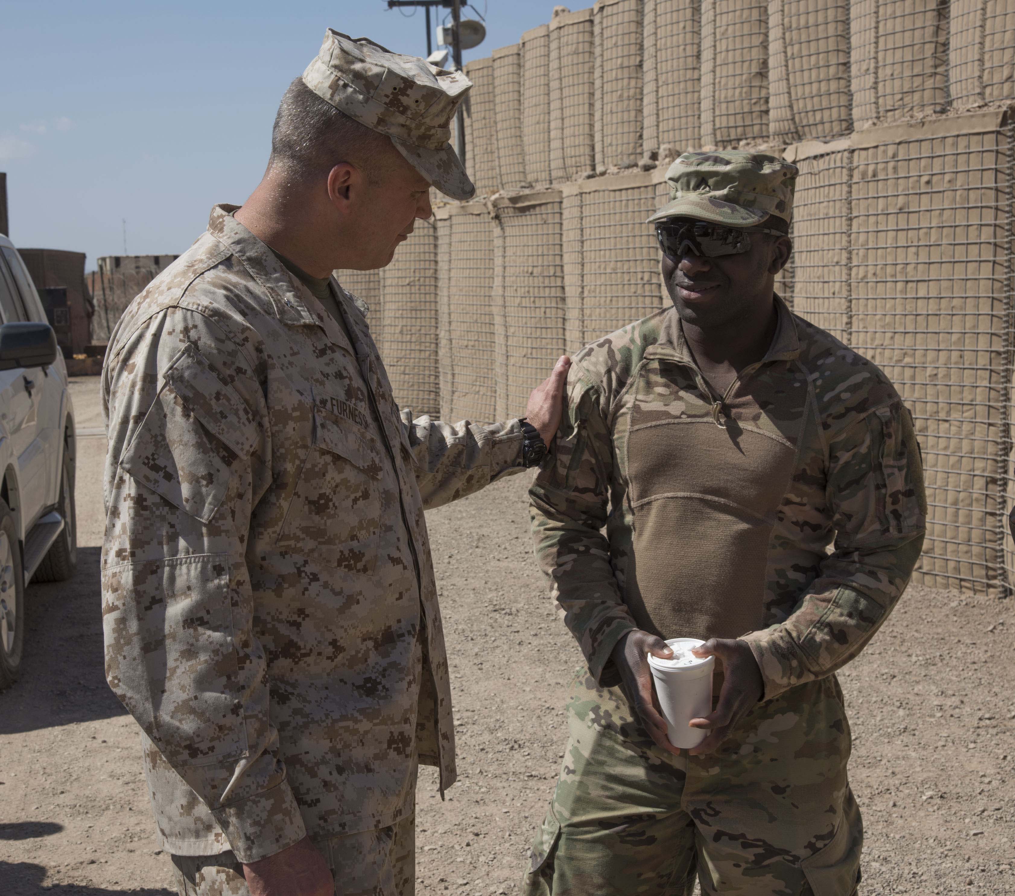 U.S. Marine Corps Brig. Gen. David J. Furness, commander of Combined Joint Task Force – Horn of Africa, visits with troops in Chabelley, Djibouti, Dec. 25, 2017. Furness spent the afternoon meeting with service members and thanking them for their continued service and sacrifice throughout the holiday season. (U.S. Air National Guard photo by Staff Sgt. Allyson L. Manners)