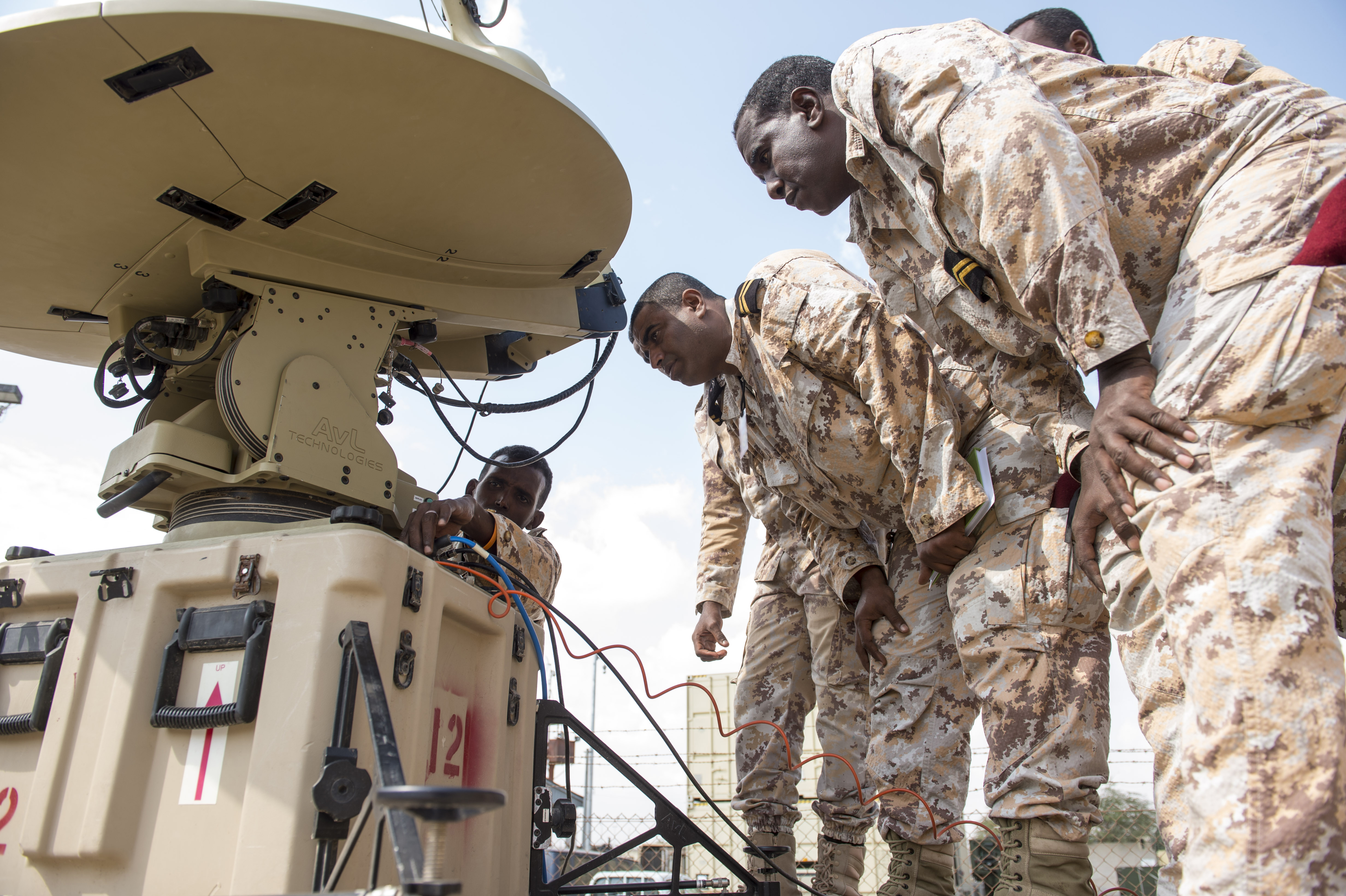 Djibouti Armed Forces (FAD) members watch as another FAD member checks the cable connections on an antenna during a military-to-military exchange course with U.S. Soldiers assigned to the Combined Joint Task Force - Horn of Africa (CJTF-HOA) Communications Directorate, at Camp Lemonnier, Djibouti, Jan. 9, 2018. Throughout a two-week period, communications experts advised Djiboutian service members on how to set up, operate, maintain, and troubleshoot network equipment to increase communication capabilities between African Union Mission in Somalia forces. (U.S. Air Force photo illustration by Staff Sgt. Timothy Moore)