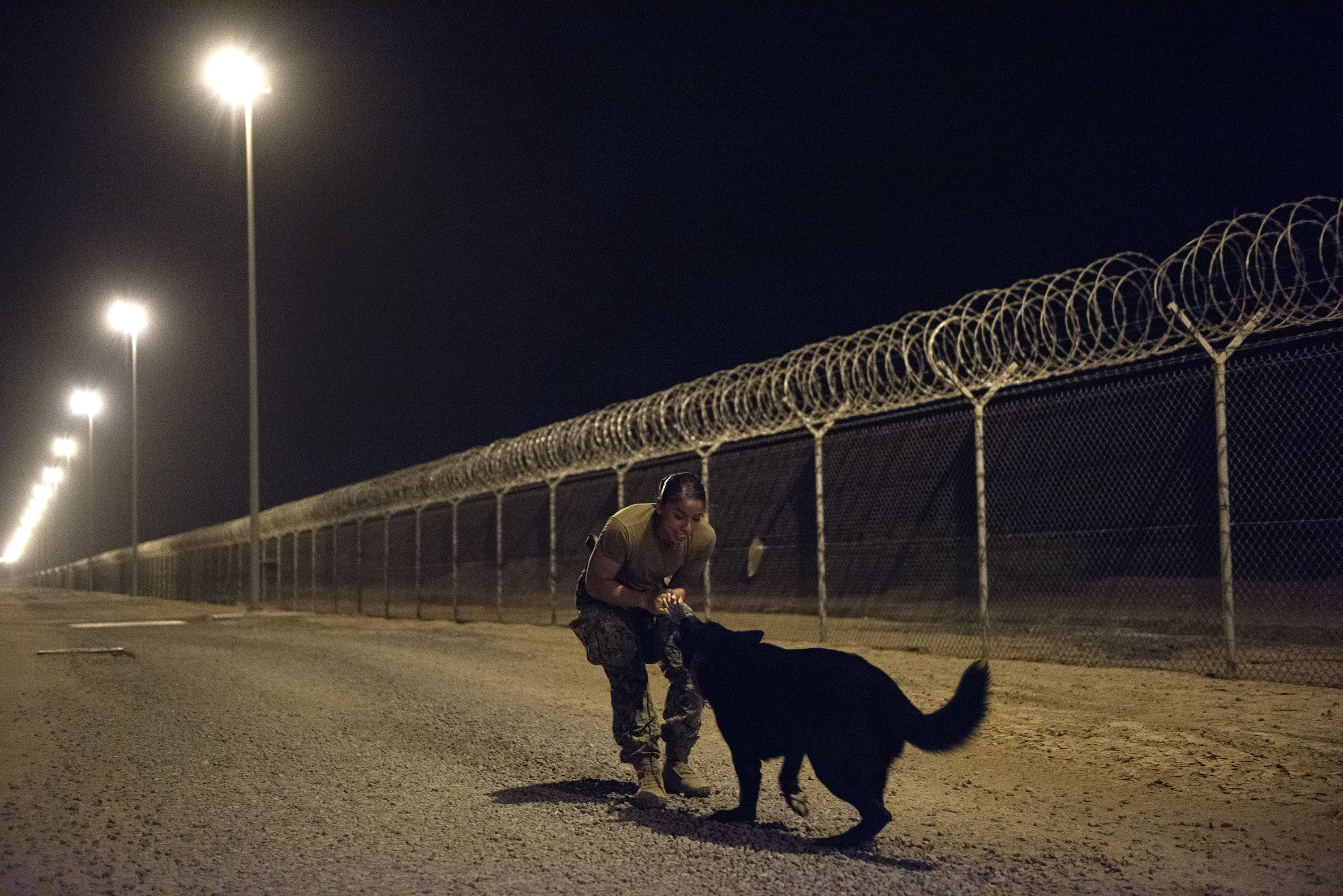 U.S. Navy Master-at-Arms 2nd Class Adrianna Lajas, a military working dog (MWD) handler rewards MWD Oliver after conducting proficiency training on Camp Lemonnier, Djibouti, July 31, 2018. Military Working Dogs can be used to perform searches, subdue suspects, and detect explosives and narcotics. (U.S. Air National Guard photo by Master Sgt. Sarah Mattison)
