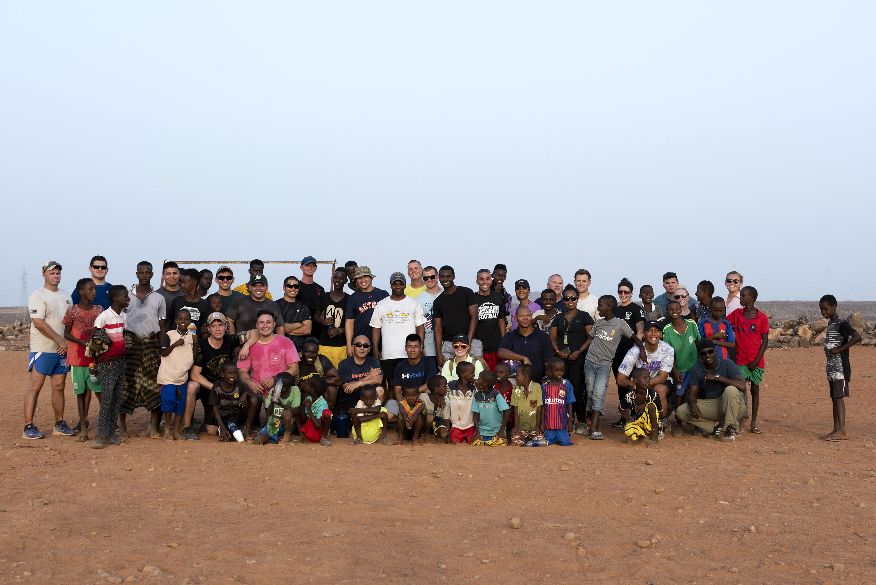U.S. Service members assigned to Combined Joint Task Force - Horn of Africa pose for a group photo with children from the nearby village outside of Chebelley Village, Djibouti, Aug. 3, 2018. Over 30 Soldiers and Airmen volunteered for the outreach event organized by the 404th Civil Affairs Battalion. (U.S. Air National Guard photo by Master Sgt. Sarah Mattison)