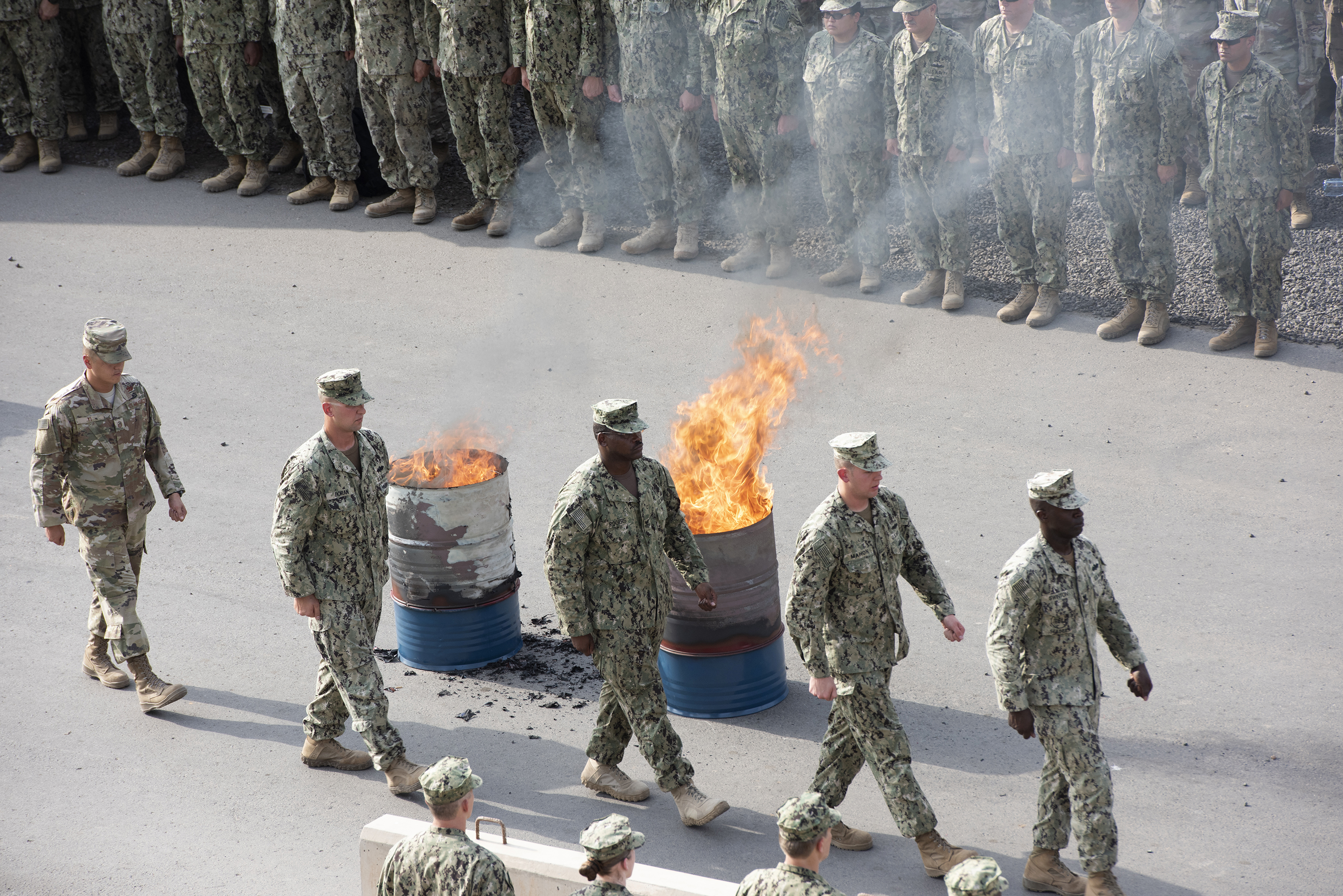 A flag detail, composed of U.S. service members, march during a 9/11 remembrance ceremony, on Camp Lemonnier, Djibouti, Sept. 11, 2018. The service members had just ceremoniously retired four American flags, one for each of the 9/11 flights. (U.S. Air National Guard photo by Master Sgt. Sarah Mattison)