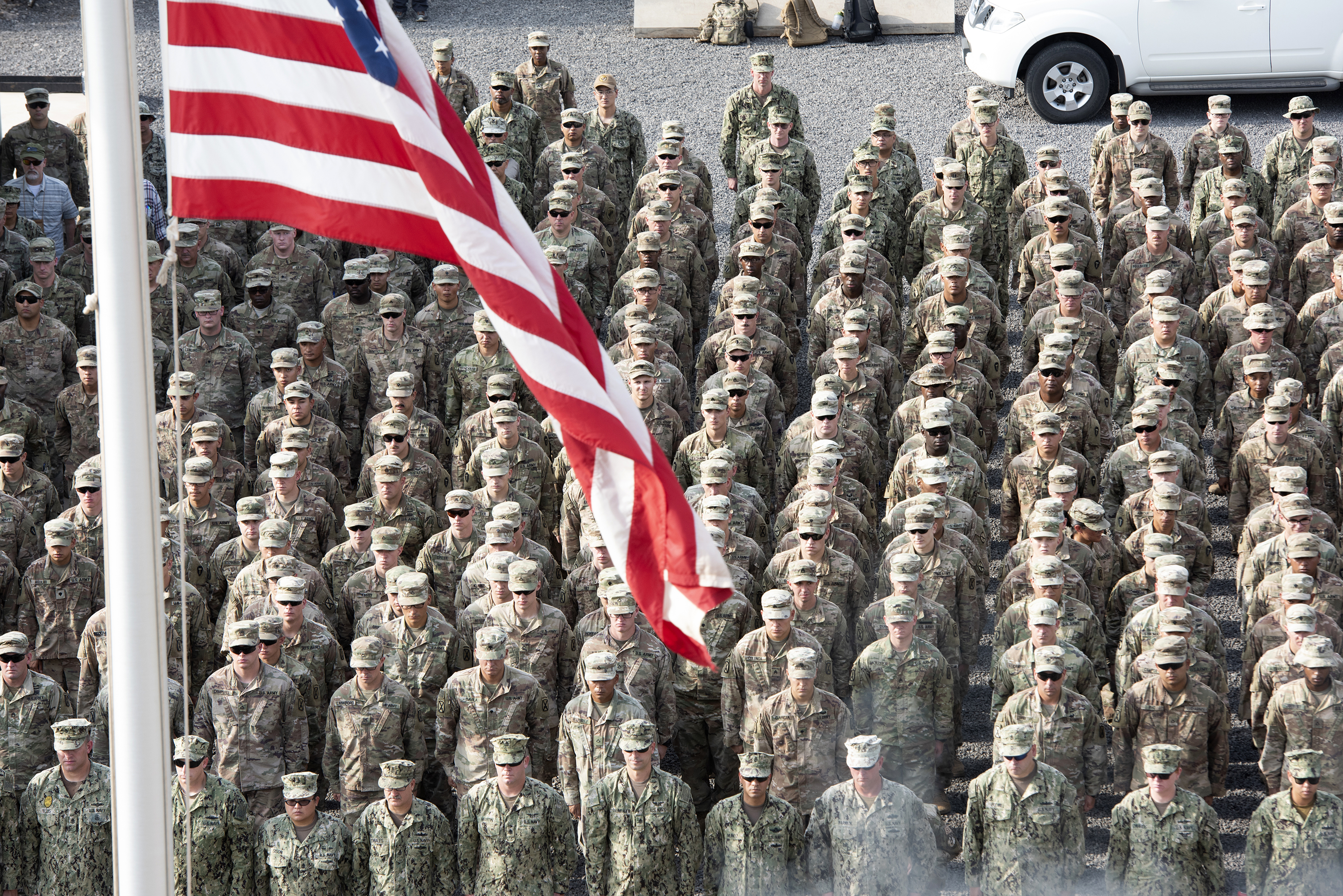U.S. service members deployed to the Horn of Africa participate in a 9/11 remembrance ceremony on Camp Lemonnier, Djibouti, Sept. 11, 2018. The service members stood at attention as four American flags, one for each of the 9/11 flights, were ceremoniously retired from Camp Lemonnier. (U.S. Air National Guard photo by Master Sgt. Sarah Mattison)