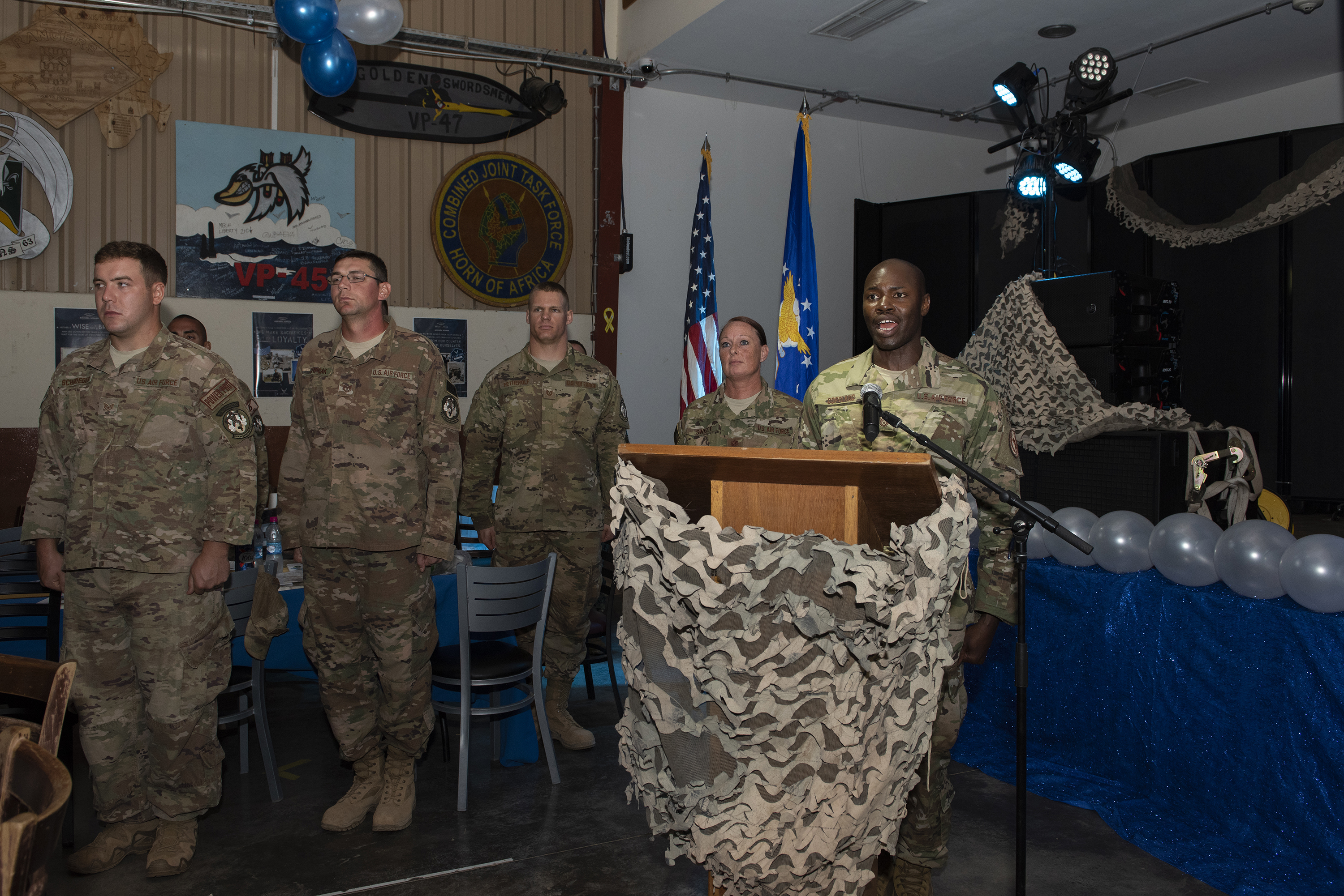 U.S. Air Force Master Sgt. Kenneth Copeland assigned to Combined Joint Task Force-Horn of Africa, sings the National Anthem on Camp Lemonnier, Djibouti, Sept. 18, 2018. U.S. service members and distinguished guests gathered together with Airmen assigned to the 449th Air Expeditionary Group and Combined Joint Task Force-Horn of Africa to celebrate the U.S. Air Force’s 71st birthday during a combat dining out. (U.S. Air National Guard photo by Master Sgt. Sarah Mattison)