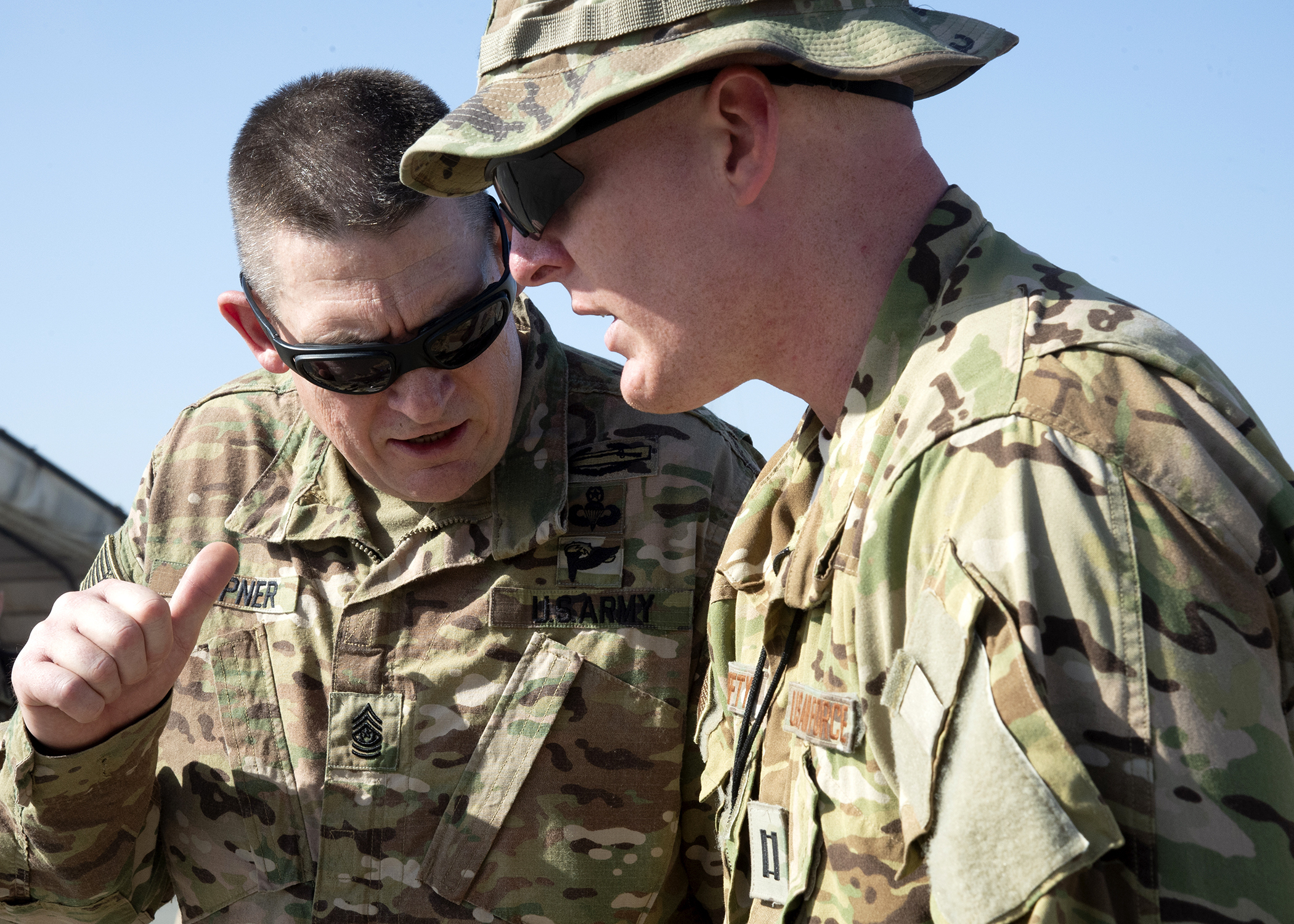 U.S. Army Command Sgt. Maj. Christopher Kepner, command sergeant major of the National Guard Bureau, speaks to U.S. Air Force Capt. Michael Hefty, director of operations, 12th Expeditionary Special Operations Squadron, on the flight line at Chabelley Airfield, Djibouti, Jan. 17, 2019. Kepner visited National Guardsmen deployed to Combined Joint Task Force-Horn of Africa Jan. 15-19, 2019. (U.S. Air Force photo by Master Sgt. Amanda Currier)