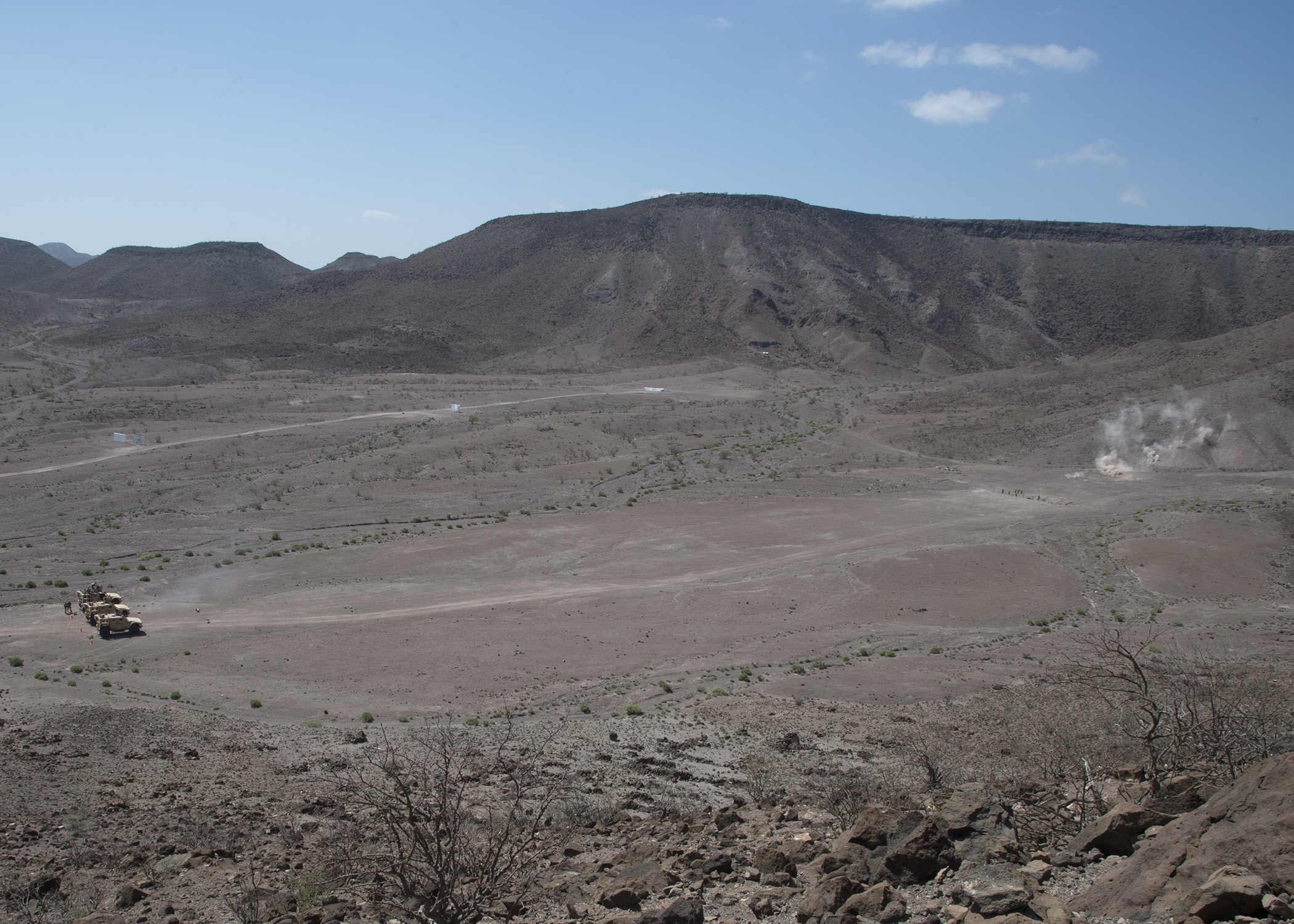 A .50-caliber machine gun mounted on a Mine-Resistant Ambush Protected vehicle maintained by Task Force Alamo, Texas National Guard, assigned to Combined Joint Task Force-Horn of Africa (CJTF-HOA), Djibouti, fires rounds at a target at a military range in Djibouti, Jan. 19, 2019. Task Force Alamo is responsible for rapidly deploying in response to any crisis threatening U.S. personnel or property throughout CJTF-HOA, an area nearly half the size of the continental United States. (U.S. Navy photo by Mass Communication Specialist 1st Class Nick Scott)