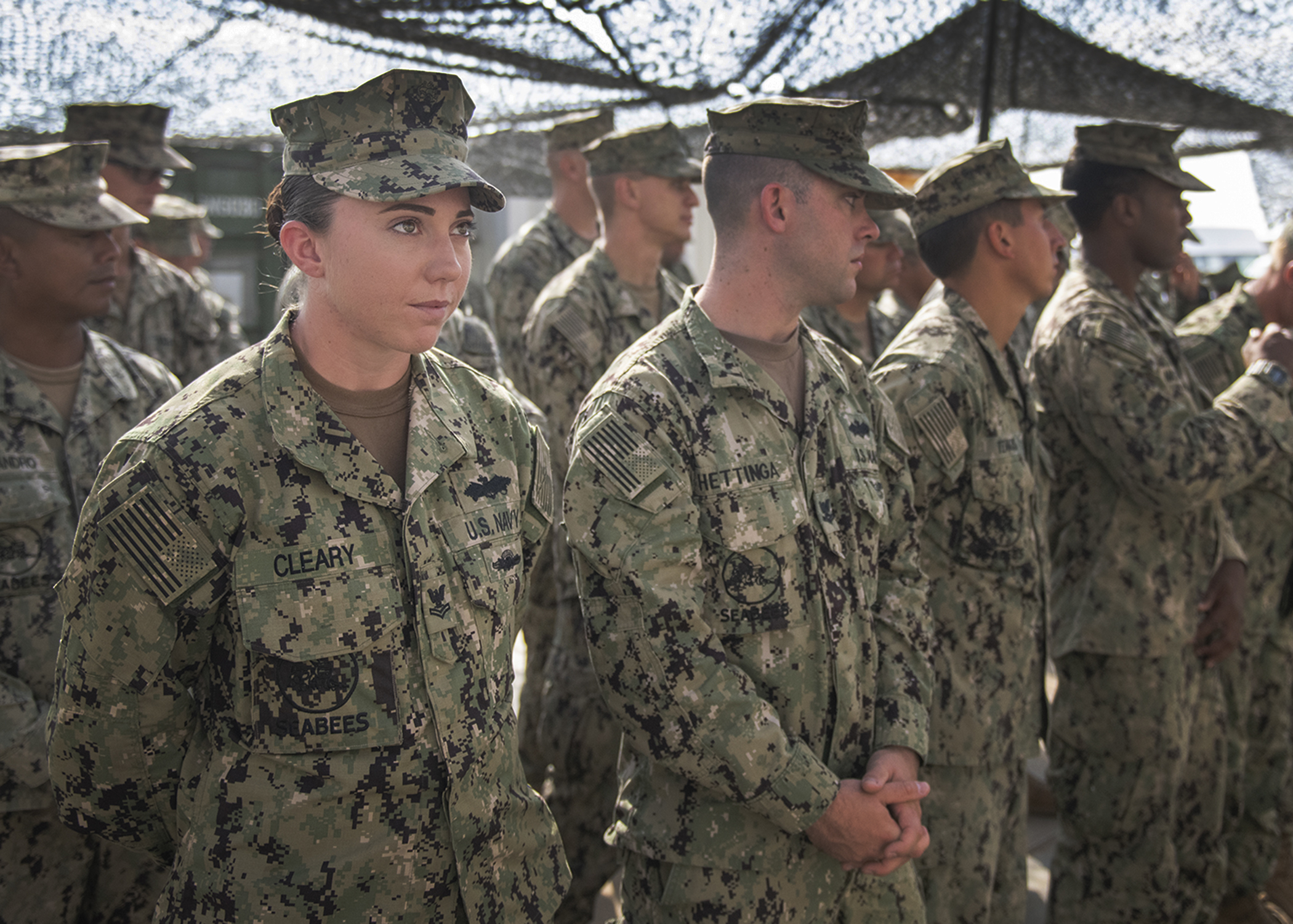 U.S. Navy Petty Officer 2nd Class Desirae Cleary, a Seabee from Naval Mobile Construction Battalion 1 (NMCB 1), assigned to Combined Joint Task Force - Horn of Africa, stands in formation while listening to Chief of Navy Reserve Vice Adm. Luke McCollum, and Assistant Secretary of the Navy (Manpower and Reserve Affairs) and retired Rear Adm. Gregory J. Slavonic address the Seabees from NMCB 1 while visiting Camp Lemonnier, Djibouti, Feb. 3, 2019. Slavonic and McCollum visited as part of a tour of Reserve units to answer questions, discuss leadership initiatives and interact with local Sailors. (U.S. Air Force photo by Tech. Sgt. Shawn Nickel)