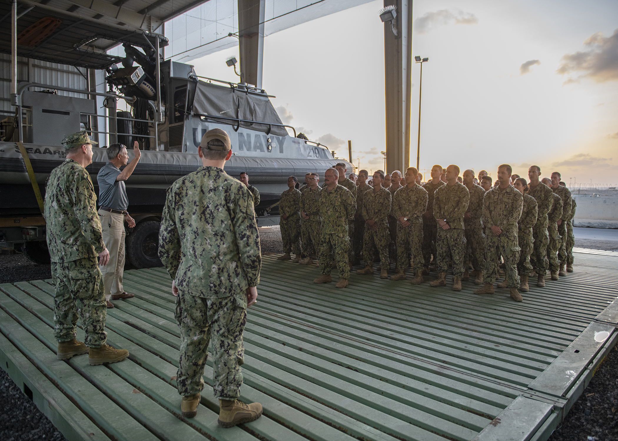 Assistant Secretary of the Navy (Manpower and Reserve Affairs) and retired Rear Adm. Gregory J. Slavonic, left, and Chief of Navy Reserve Vice Adm. Luke McCollum speak to Sailors from Coastal Riverine Squadron 11, assigned to Combined Joint Task Force - Horn of Africa, while visiting Camp Lemonnier, Djibouti, Feb. 3, 2019. Slavonic and McCollum visited as part of a tour of Reserve units to answer questions, discuss leadership initiatives and interact with local Sailors. (U.S. Air Force photo by Tech. Sgt. Shawn Nickel)