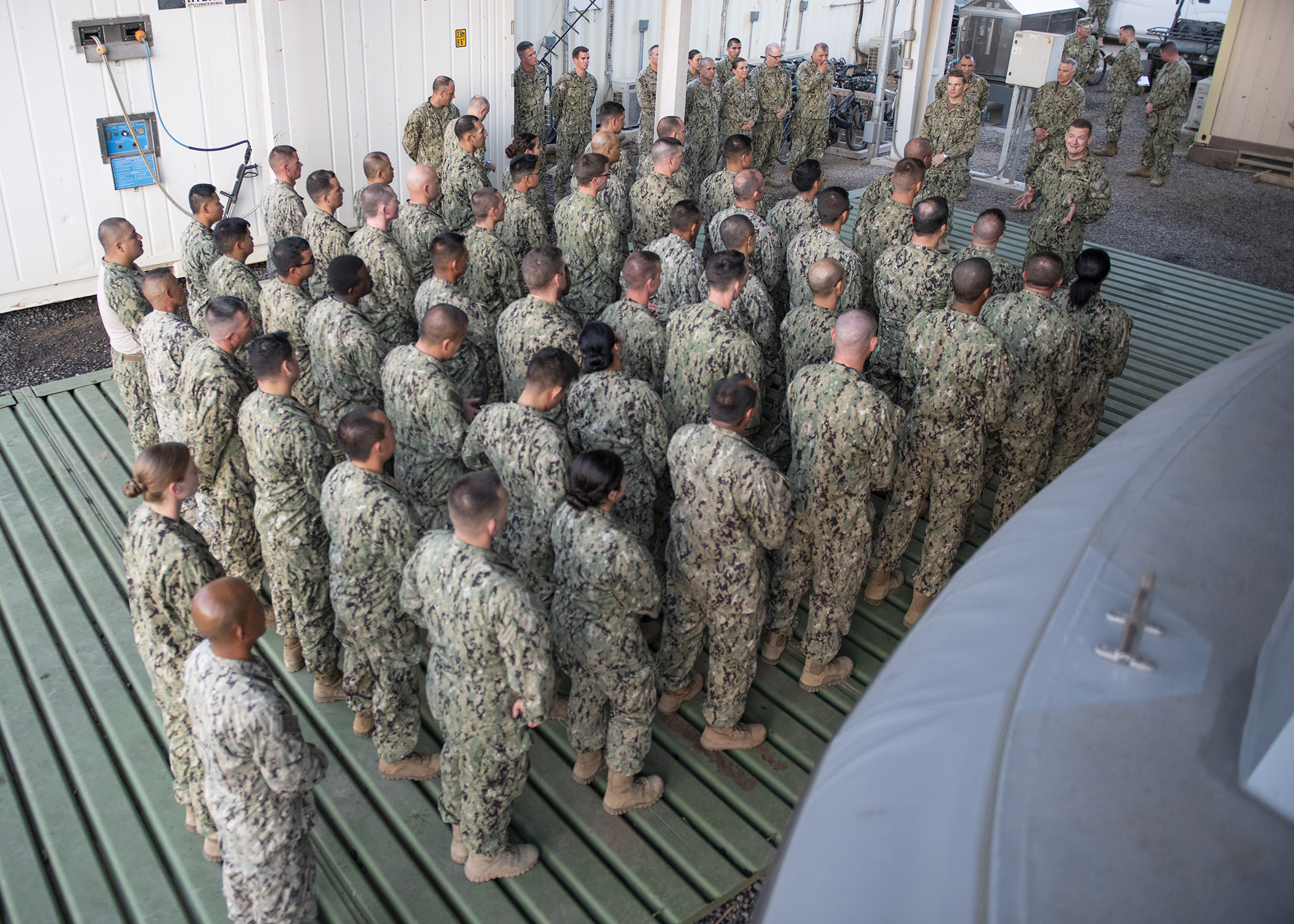 Chief of Navy Reserve Vice Adm. Luke McCollum speaks to Sailors from Coastal Riverine Squadron 11, assigned to Combined Joint Task Force - Horn of Africa, while visiting Camp Lemonnier, Djibouti, Feb. 3, 2019. McCollum visited as part of a tour of Reserve units to answer questions, discuss leadership initiatives and interact with local Sailors. (U.S. Air Force photo by Tech. Sgt. Shawn Nickel)