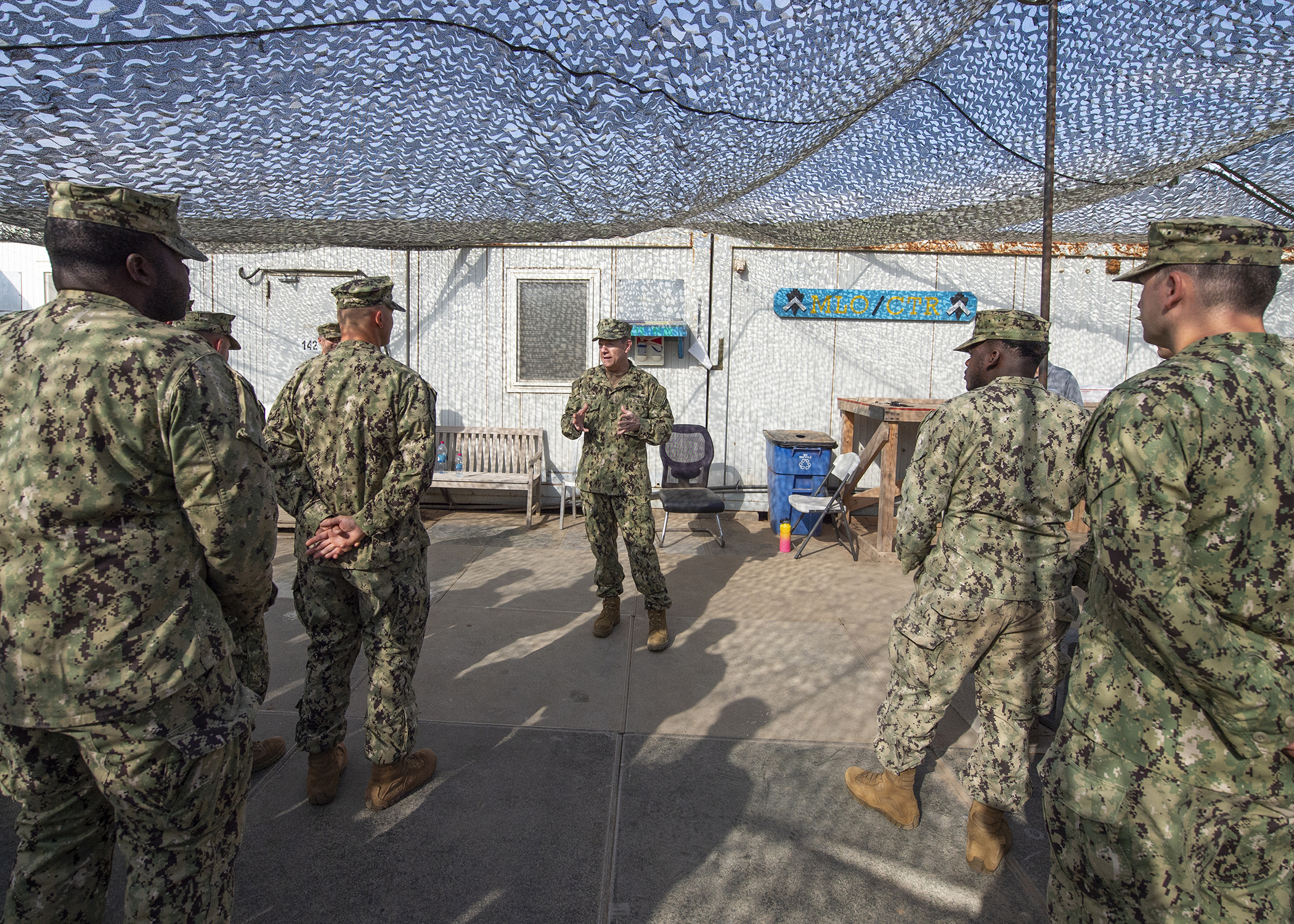 Chief of Navy Reserve Vice Adm. Luke McCollum addresses U.S. Navy Seabees, from Naval Mobile Construction Battalion 1, assigned to Combined Joint Task Force - Horn of Africa, while visiting Camp Lemonnier, Djibouti, Feb. 3, 2019. McCollum visited as part of a tour of Reserve units to answer questions, discuss leadership initiatives and interact with local Sailors. (U.S. Air Force photo by Tech. Sgt. Shawn Nickel)