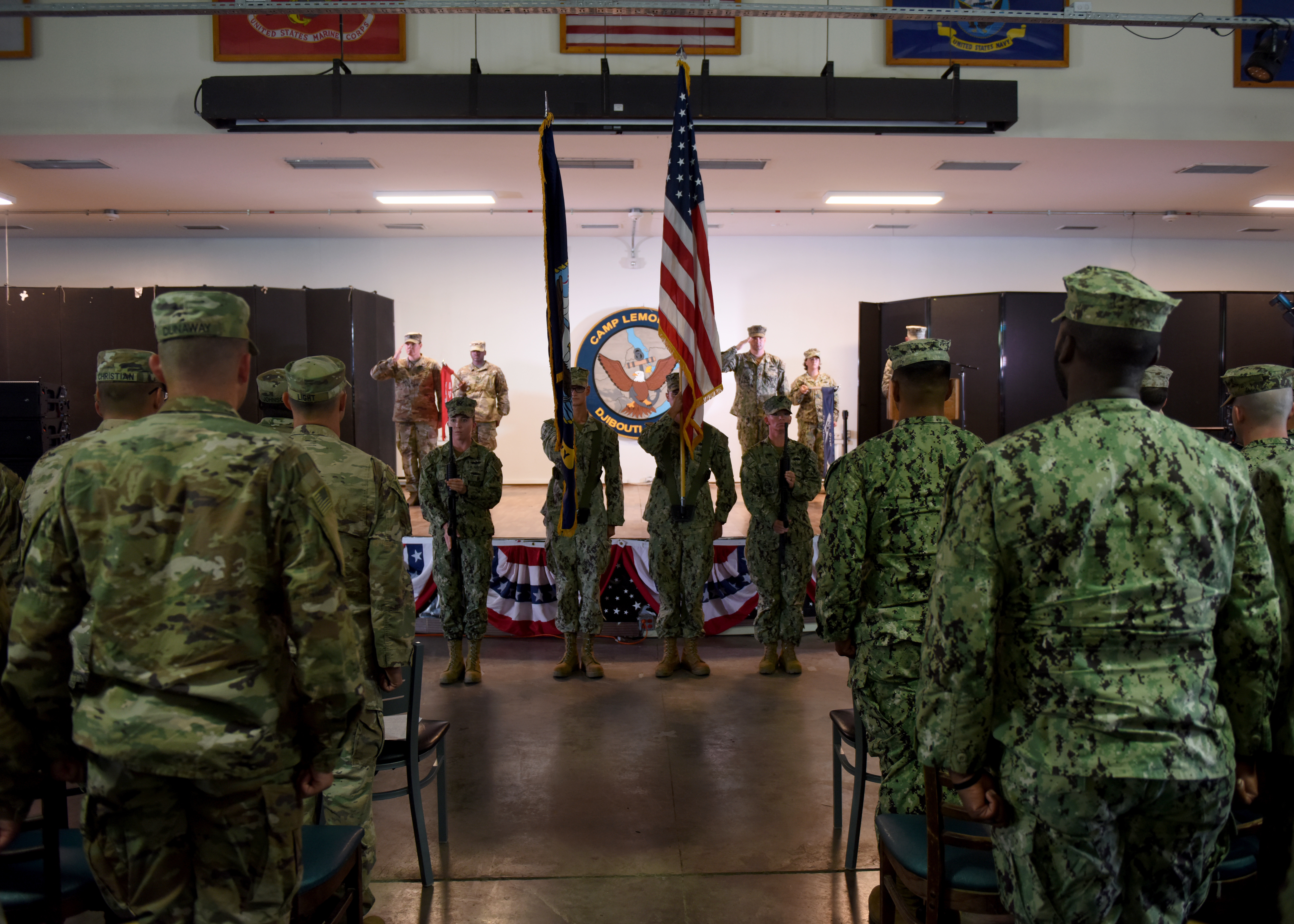 U.S. Navy Seabees from Naval Mobile Construction Battalion (NMCB) 1, assigned to Combined Joint Task Force-Horn of Africa (CJTF-HOA), present the colors during a transfer-of-authority ceremony at Camp Lemonnier, Djibouti, Feb. 11, 2019. The NMCB 1 transferred authority of building and improving facilities on base and in the combined joint operations area and area of interest to the U.S. Army 465th Engineer Company, 926th Engineer Battalion, 926th Engineer Brigade, 412th Theater Engineer Command, based in Birmingham, Alabama, assigned to CJTF-HOA. (U.S. Air Force photo by Staff Sgt. Franklin R. Ramos)