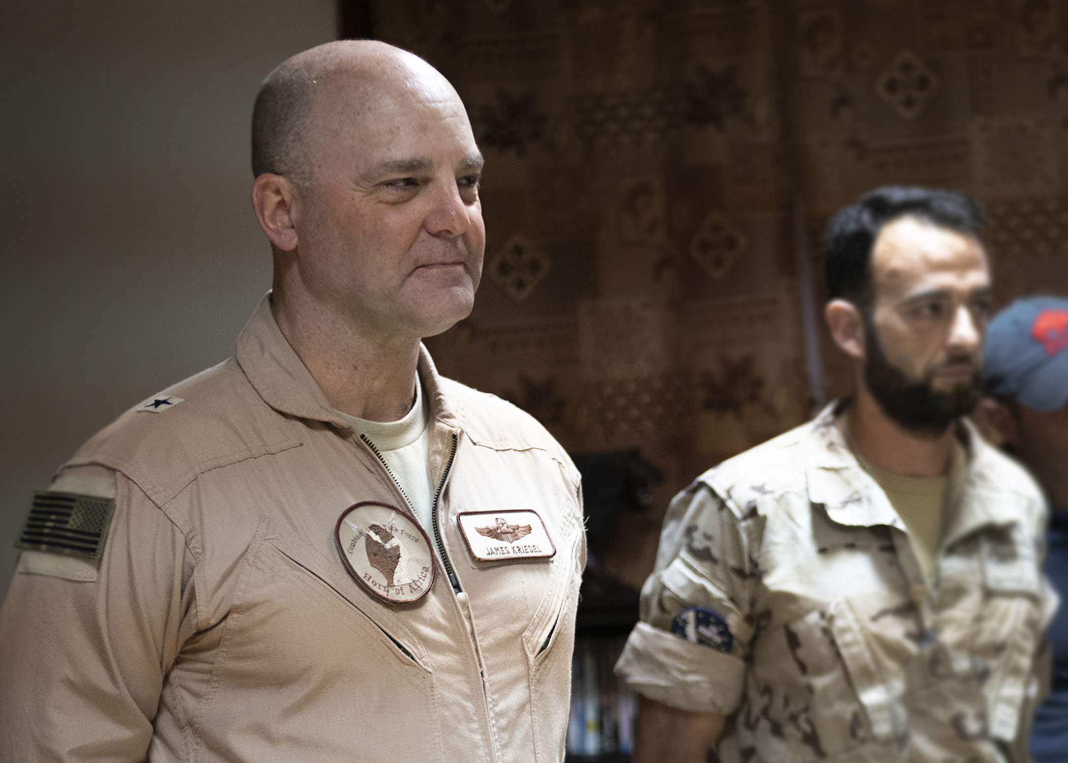 U.S. Air Force Brig. Gen. James R. Kriesel, deputy commanding general, Combined Joint Task Force-Horn of Africa, watches a coin presentation during a cultural exchange event at Camp Lemonnier, Djibouti, Feb. 27, 2019. Multinational military partners affiliated with Camp Lemonnier hold monthly exchange events to strengthen alliances and attract new partners in the combined joint military environment. (U.S. Air Force photo by Tech. Sgt. Shawn Nickel)