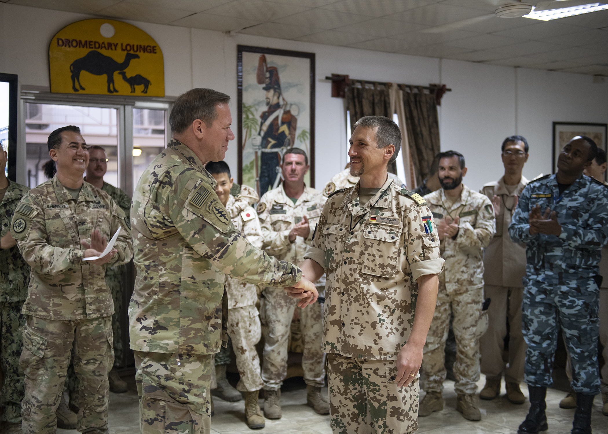 U.S. Army Maj. Gen. James D. Craig, left, commanding general, Combined Joint Task Force-Horn of Africa, presents a coin to German Navy Cmdr. Dirk Muller, German detachment commander for the European Union Naval Force ATALANTA, the