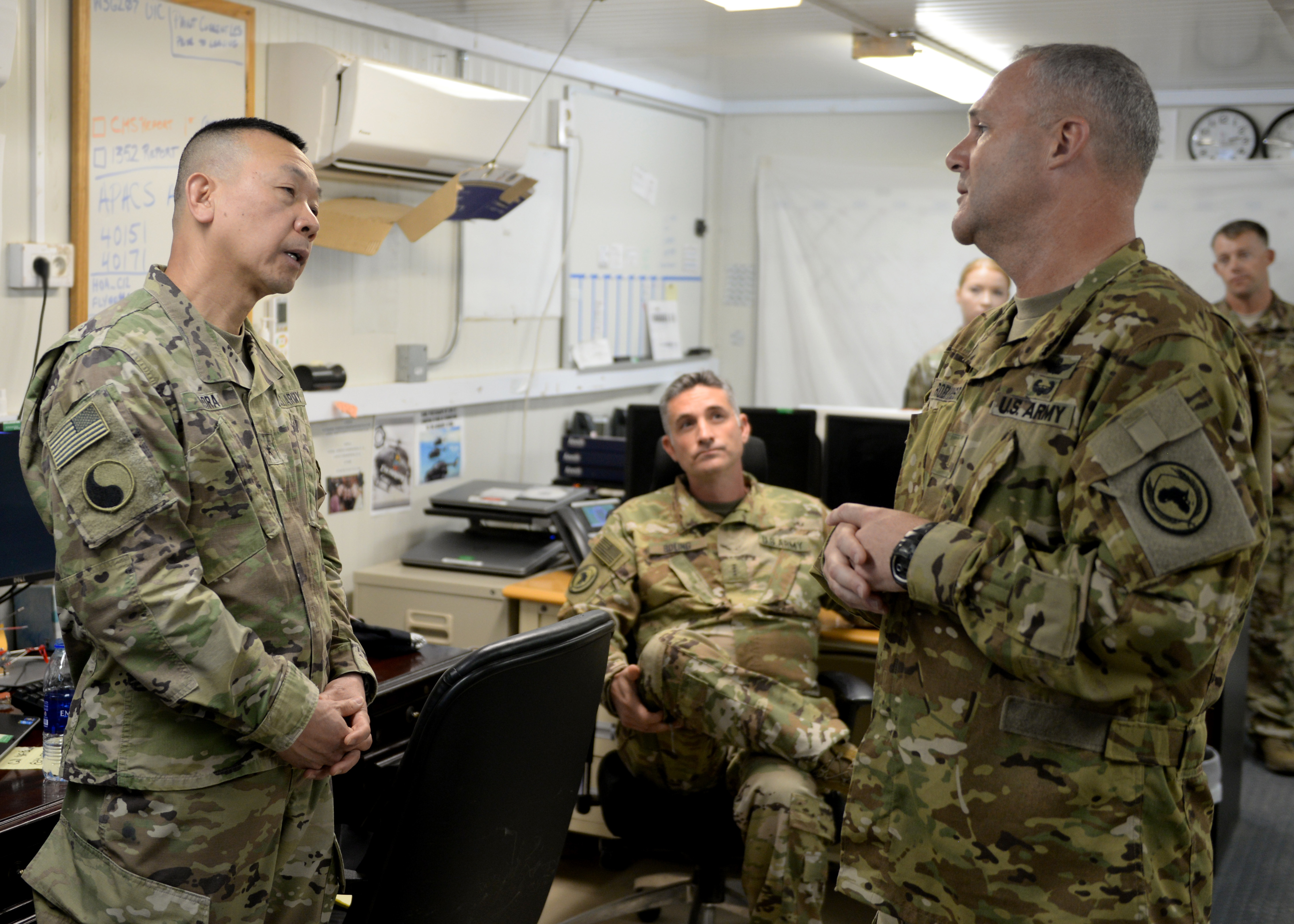 U.S. Army Brig. Gen. Lapthe C. Flora, left, deputy commanding general of U.S. Army Africa (USARAF), talks to U.S. Army Chief Warrant Officer 5 Allen Robinson, commander of an Army Aviation Detachment, assigned to Combined Joint Task Force-Horn of Africa (CJTF-HOA), during Flora's visit to Camp Lemonnier, Djibouti, March 6, 2019. Flora visited to familiarize himself with the U.S. Army units embedded in CJTF-HOA and to help foster a better partnership between USARAF and CJTF-HOA. (U.S. Air Force photo by Staff Sgt. Franklin R. Ramos)