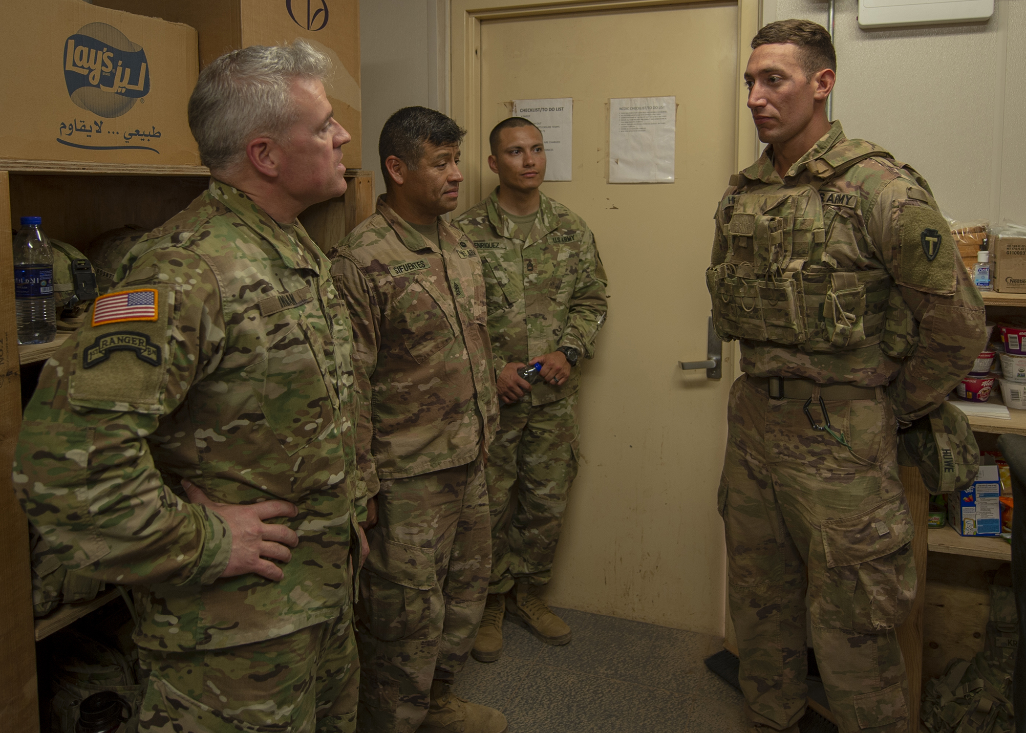 U.S. Army Command Sgt. Maj. Jeremiah E. Inman, left, command sergeant major of U.S. Army Africa (USARAF), recognizes the superior performance of U.S. Army Sgt. Jonathan Huwe, an infantryman for 1st Platoon, 3-141 Infantry Regiment, Task Force Alamo, Texas National Guard, assigned to Combined Joint Task Force-Horn of Africa (CJTF-HOA), during Inman’s visit to a forward operating location in East Africa, March 12, 2019. Inman visited to familiarize himself with the U.S. Army units embedded in CJTF-HOA and to help foster a better partnership between USARAF and CJTF-HOA. (U.S. Air Force photo by Tech. Sgt. Shawn Nickel)