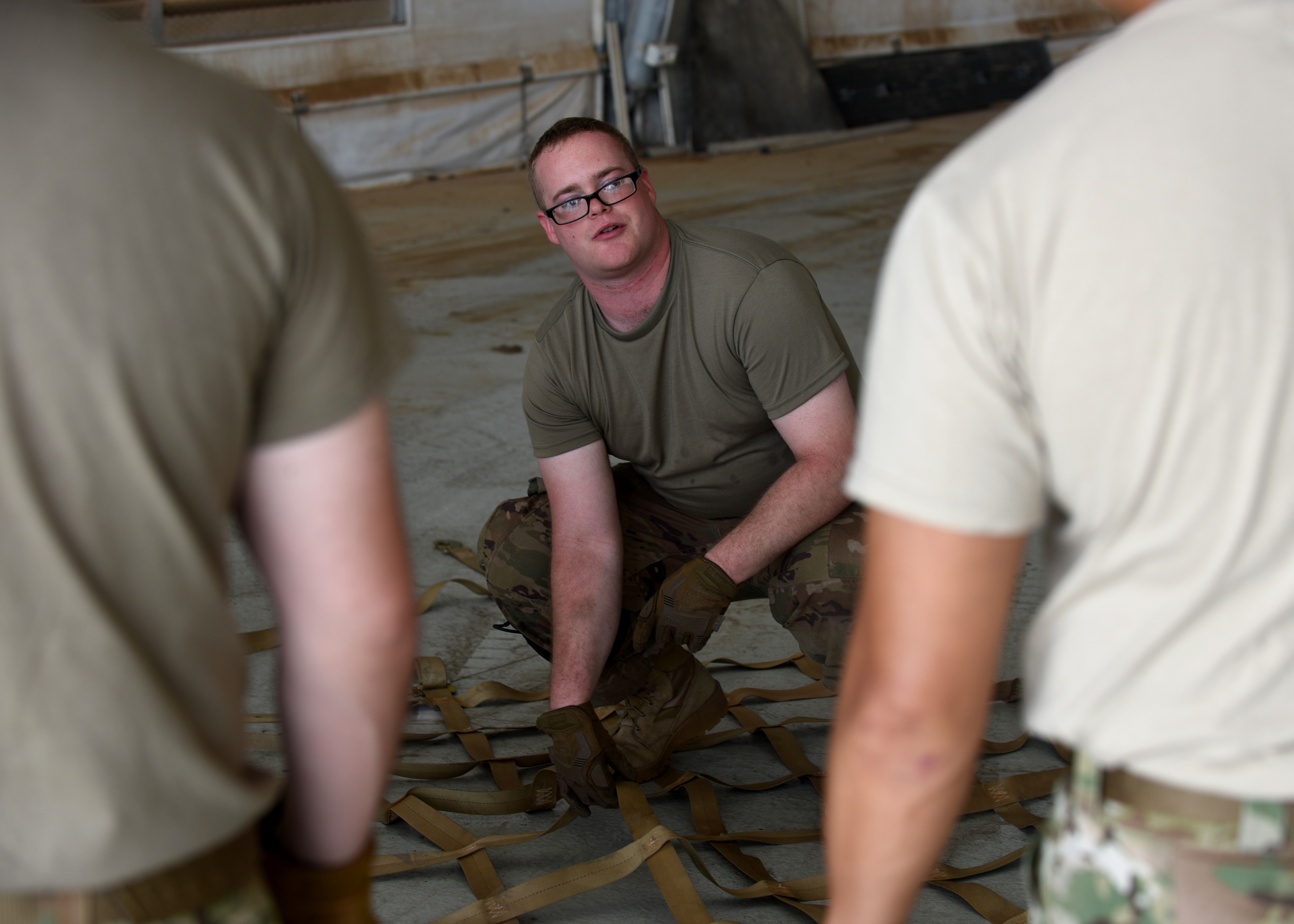 U.S. Air Force Senior Airman Cody Forth, mobile aerial porter for the 435th Contingency Response Group, Ramstein Air Base, Germany, supporting Combined Joint Task Force-Horn of Africa (CJTF-HOA), provides instructions for inspecting cargo nets used to transport U.S. Agency for International Development (USAID) supplies at Camp Lemonnier, Djibouti, April 1, 2019, for the U.S. Department of Defense's (DoD) relief effort in the Republic of Mozambique and surrounding areas following Cyclone Idai. Teams supporting CJTF-HOA, which is leading the DoD relief effort, prepared cargo for transport following a call for assistance from the USAID Disaster Assistance Response Team. (U.S. Air Force photo by Staff Sgt. Franklin R. Ramos)