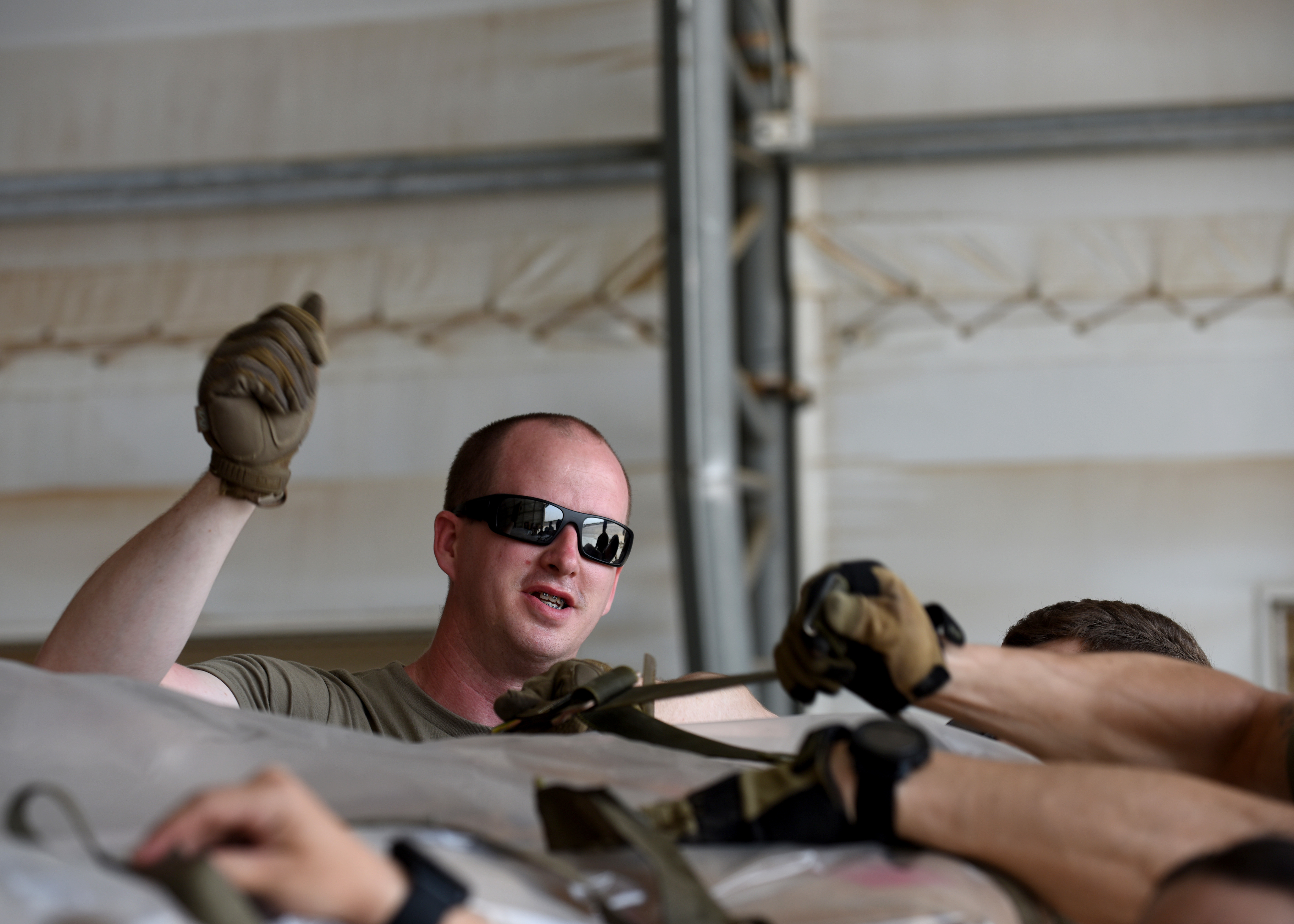 U.S. Air Force Staff Sgt. Alan Wells, mobile aerial port supervisor for the 435th Contingency Response Group, Ramstein Air Base, Germany, currently at Camp Lemonnier, Djibouti, supporting Combined Joint Task Force-Horn of Africa (CJTF-HOA), ties U.S. Agency for International Development (USAID) food supplies onto a cargo pallet at Camp Lemonnier, April 1, 2019, for the U.S. Department of Defense's (DoD) humanitarian relief effort in the Republic of Mozambique and surrounding areas following Cyclone Idai. Teams supporting CJTF-HOA, which is leading the DoD relief effort, prepared cargo for transport following a call for assistance from the USAID Disaster Assistance Response Team. (U.S. Air Force photo by Staff Sgt. Franklin R. Ramos)