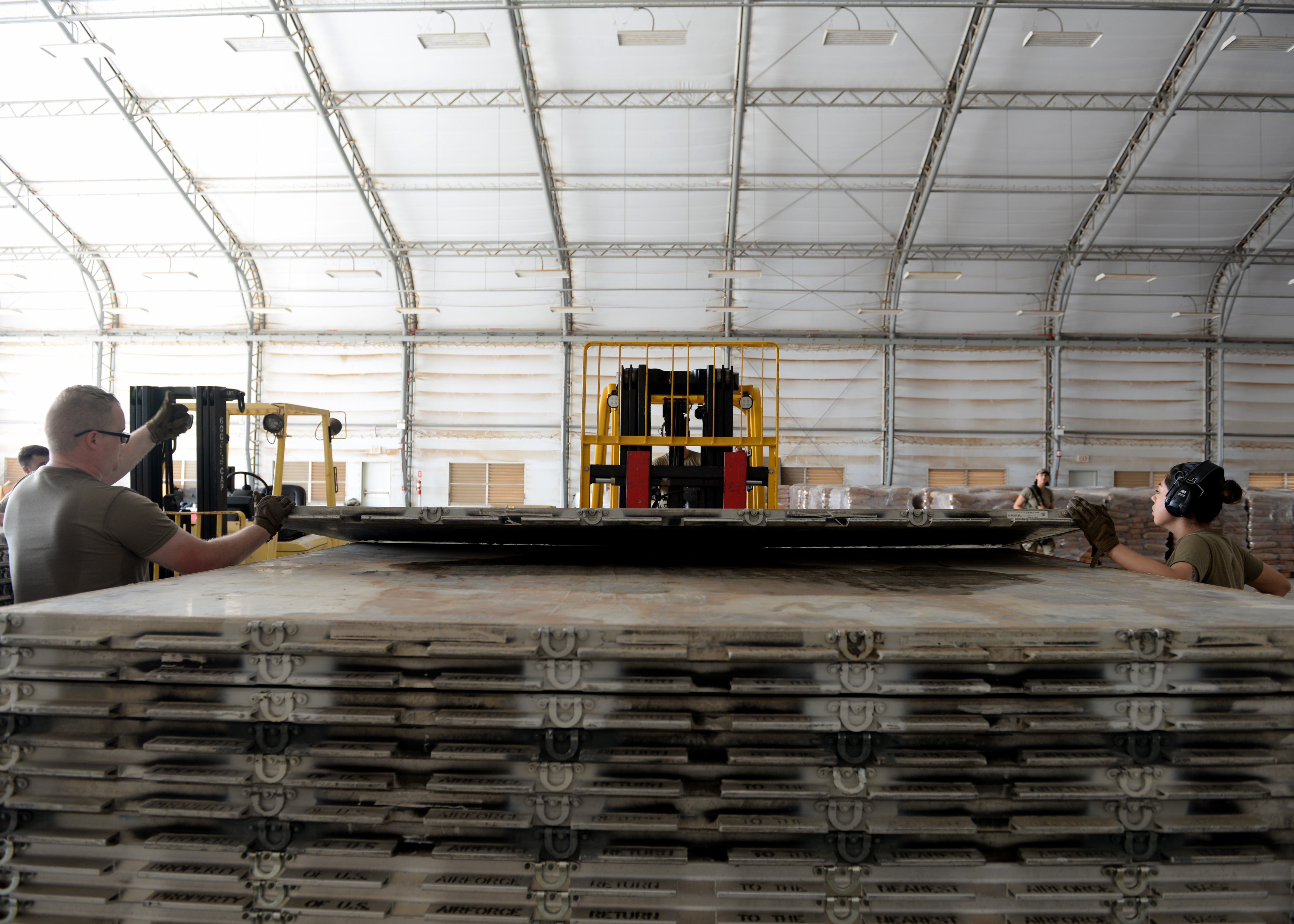 U.S. Air Force Airmen from the 435th Contingency Response Group, Ramstein Air Base, Germany, currently at Camp Lemonnier, Djibouti, supporting Combined Joint Task Force-Horn of Africa (CJTF-HOA), unload a cargo pallet used to transport U.S. Agency for International Development (USAID) supplies at Camp Lemonnier, April 1, 2019, for the U.S. Department of Defense's (DoD) humanitarian relief effort in the Republic of Mozambique and surrounding areas following Cyclone Idai. Teams supporting CJTF-HOA, which is leading the DoD relief effort, prepared cargo for transport following a call for assistance from the USAID Disaster Assistance Response Team. (U.S. Air Force photo by Staff Sgt. Franklin R. Ramos)