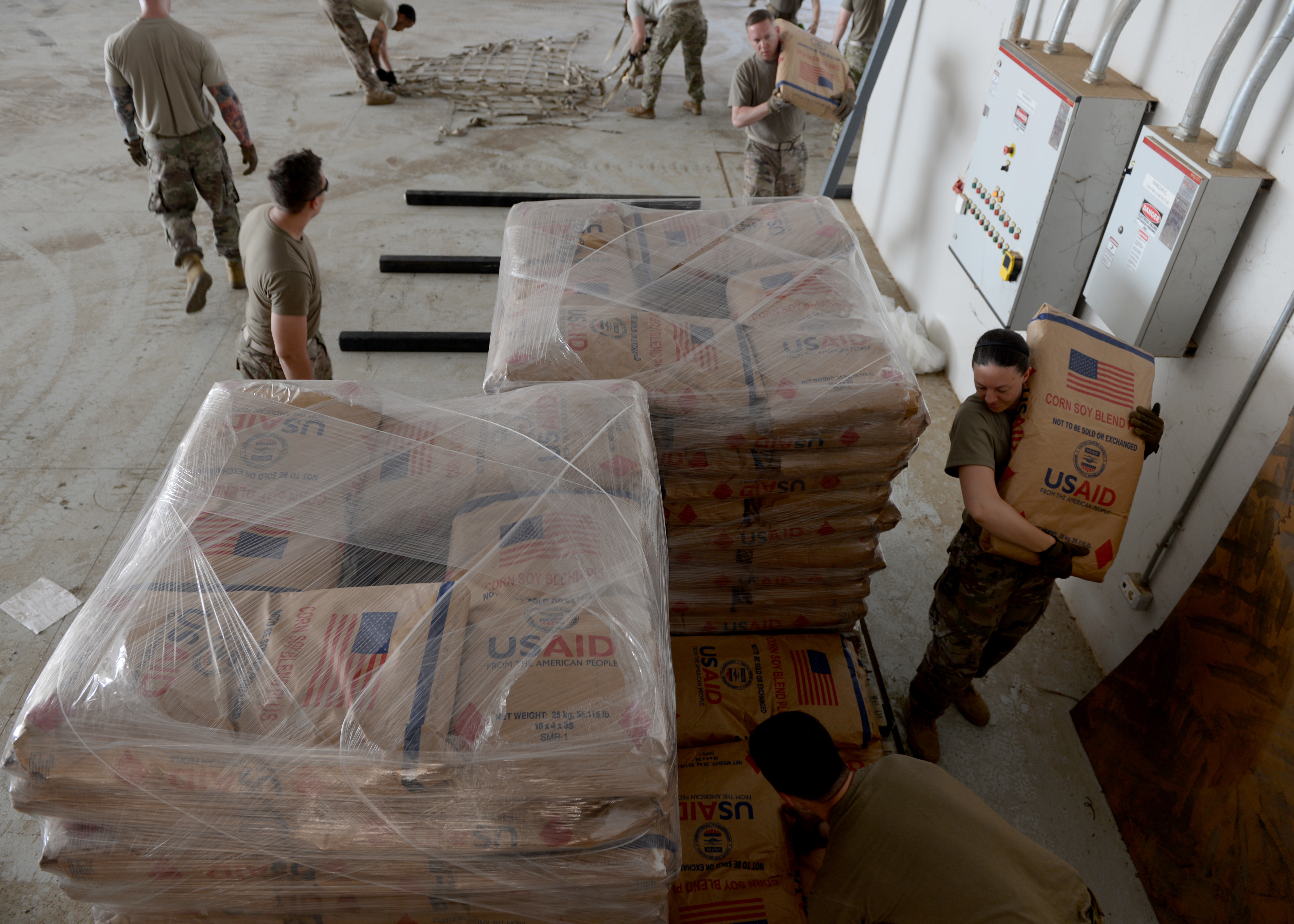 U.S. Air Force Airmen from the 435th Contingency Response Group, Ramstein Air Base, Germany, currently at Camp Lemonnier, Djibouti, supporting Combined Joint Task Force-Horn of Africa (CJTF-HOA), load U.S. Agency for International Development (USAID) supplies onto a cargo pallet at Camp Lemonnier, April 1, 2019, for the U.S. Department of Defense's (DoD) humanitarian relief effort in the Republic of Mozambique and surrounding areas following Cyclone Idai. Teams supporting CJTF-HOA, which is leading the DoD relief effort, prepared cargo for transport following a call for assistance from the USAID Disaster Assistance Response Team. (U.S. Air Force photo by Staff Sgt. Franklin R. Ramos)