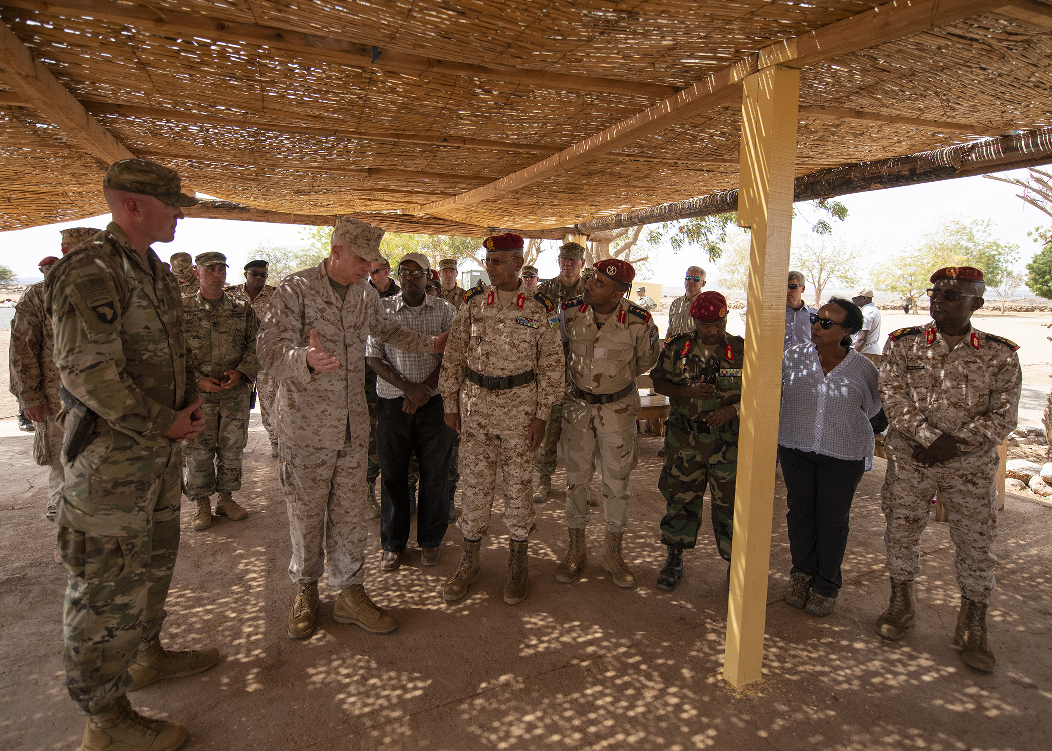 U.S. Marine Corps Gen. Thomas D. Waldhauser, left center, commander of U.S. Africa Command, comments on a brief about partner training delivered bythe officer in charge of NCO training for the Rapid Intervention Battalion (RIB), U.S. Army 1st Lt. Travis Holihan, Headquarters Company, 1-26 Infantry Battalion, 2nd Brigade Combat Team, 101st Airborne, assigned to Combined Joint Task Force-Horn of Africa, during a visit with senior Djiboutian officials, including Chief of General Staff of the Djibouti Armed Forces Zakaria Cheik Ibrahim, at a training base in Djibouti, March 21, 2019. While in Djibouti, Waldhauser observed the ongoing growth and development of the RIB, the Djiboutian army’s elite military force, which the U.S. is in the process of training and equipping at the request of the Djiboutian government. (U.S. Air Force photo by Tech. Sgt. Shawn Nickel)
