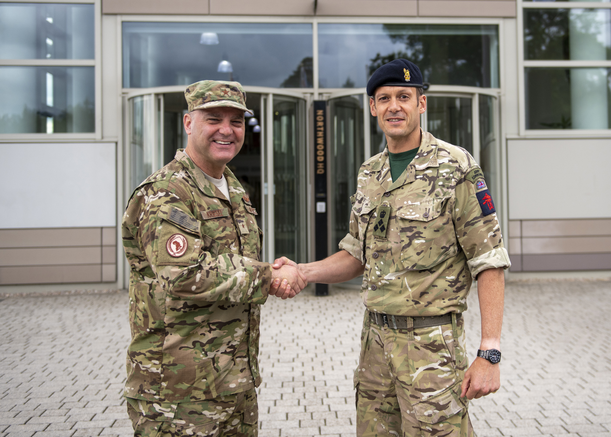 U.S. Air Force Brig. Gen. James R. Kriesel, deputy commanding general of Combined Joint Task Force-Horn of Africa, left, shake hands with Brig. John Ridge, chief of joint force operations at Permanent Joint Headquarters (PJHQ), at PJHQ, June 5, 2019. Kriesel visited the U.K. to build relations with leaders across the Ministry of Defense and familiarize himself with the partner nation’s information exchange policies, which is mission essential in support of national objectives. (U.S. Air Force photo by Tech. Sgt. Shawn Nickel)