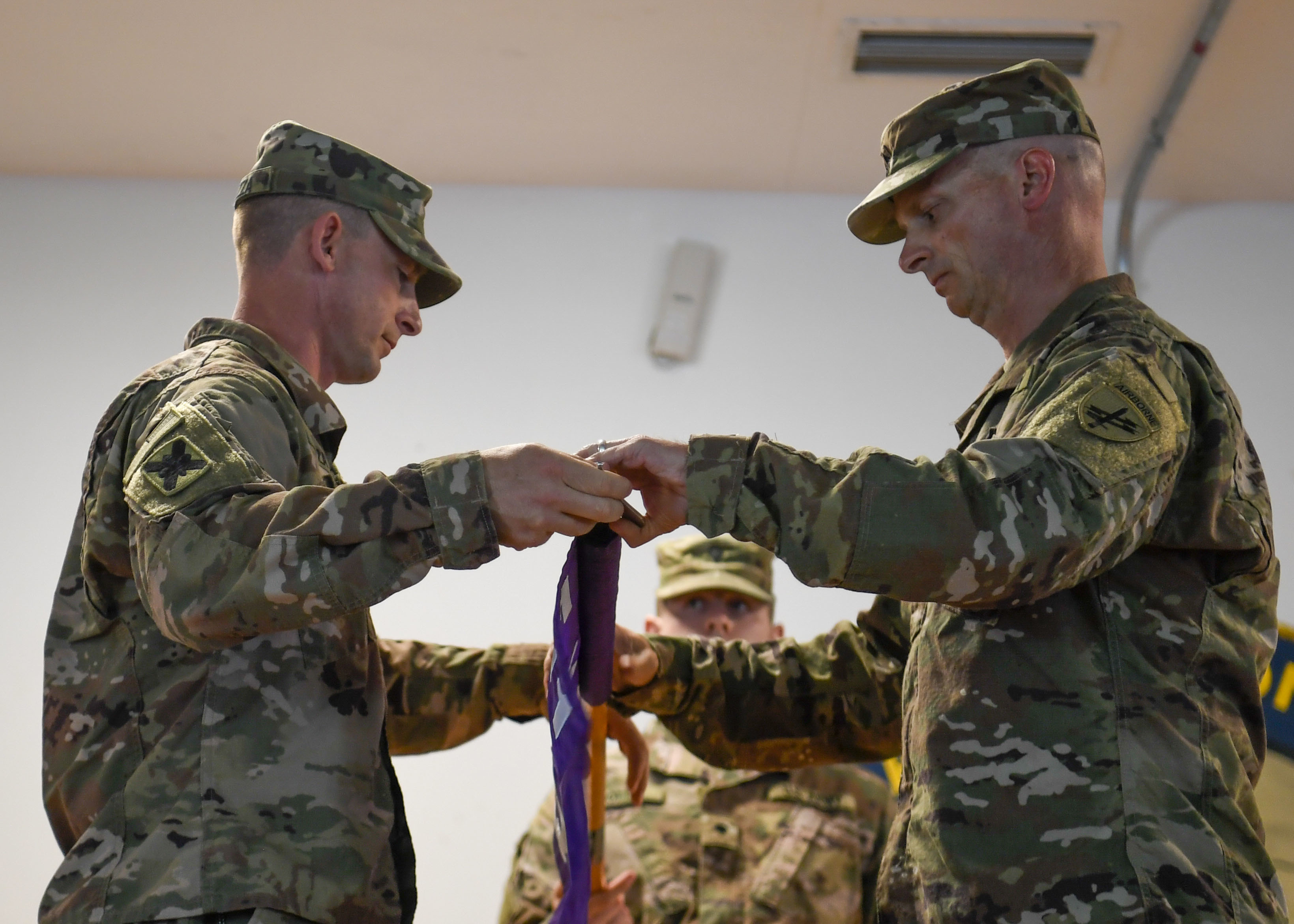 U.S. Army Lt. Col. Cecil Piazza, 411th Civil Affairs (CA) Battalion commander, assigned to Combined Joint Task Force-Horn of Africa (CJTF-HOA), and U.S. Army Sgt. Maj. Ryan Whitson, 411th CA Battalion command sergeant major, assigned to CJTF-HOA, unfurl their unit’s guidon flag during a transfer of authority ceremony at Camp Lemonnier, Djibouti, July 9, 2019. The 411th CA Battalion assumed civil affairs responsibilities for CJTF-HOA from the 403rd CA Battalion. Civil Affairs Soldiers are the governance and foreign-culture experts of the Army. (U.S. Air Force photo by Staff Sgt. J.D. Strong II)