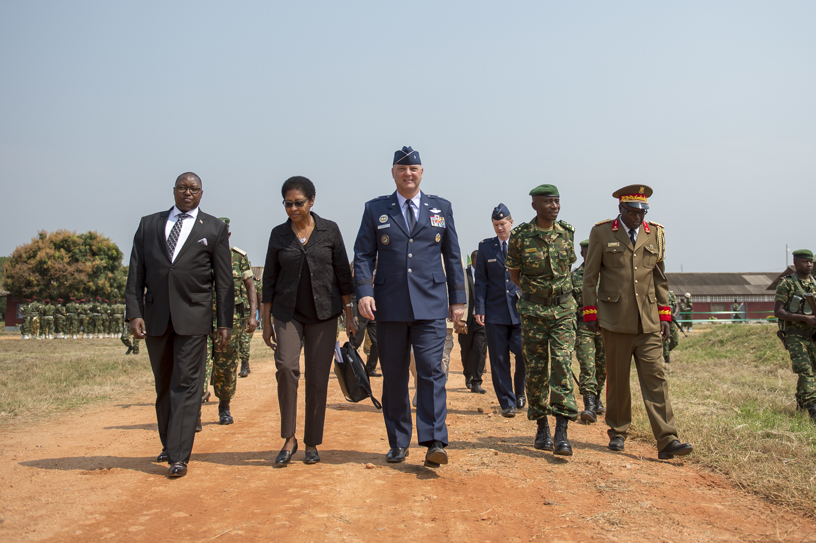 U.S. Amb. Eunice S. Reddick, the U.S. Charge d’affaires to Burundi, and former Ambassador to Gabon and Niger, and U.S. Air Force Brig. Gen. James R. Kriesel, deputy commanding general of Combined Joint Task Force-Horn of Africa, approach the graduation field at the Burundi National Defence Force Senior Command and Staff College, in Bujumbura, Burundi, July 19, 2019. The graduating class consisted of 28 students from four countries in the East African Community countries. (U.S. Air Force Photo by Senior Airman Codie Trimble)