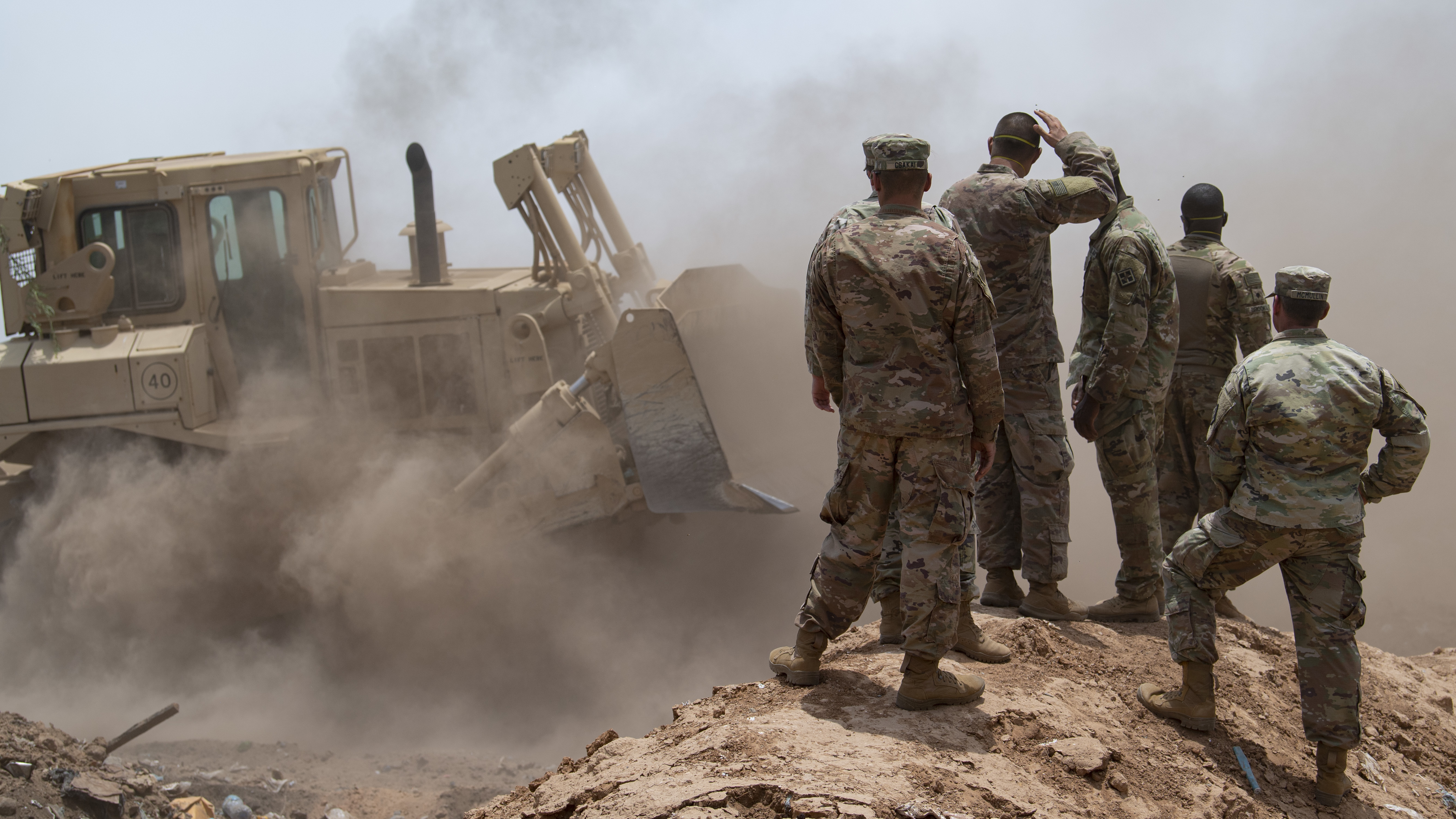 U.S. Army Soldiers from 465th Engineer Company, 926th Engineer Battalion, 926th Engineer Brigade, 412th Theater Engineer Command, based in Birmingham, Alabama, assigned to Combined Joint Task Force-Horn of Africa, assess the building of a dirt berm at the Douda landfill in Djibouti, Aug. 14, 2019. During a fire at the landfill, the 465th used bulldozers to create dirt berms that would make firebreaks and stop the flames from spreading outward. (U.S. Air Force photo by Staff Sgt. J.D. Strong II)