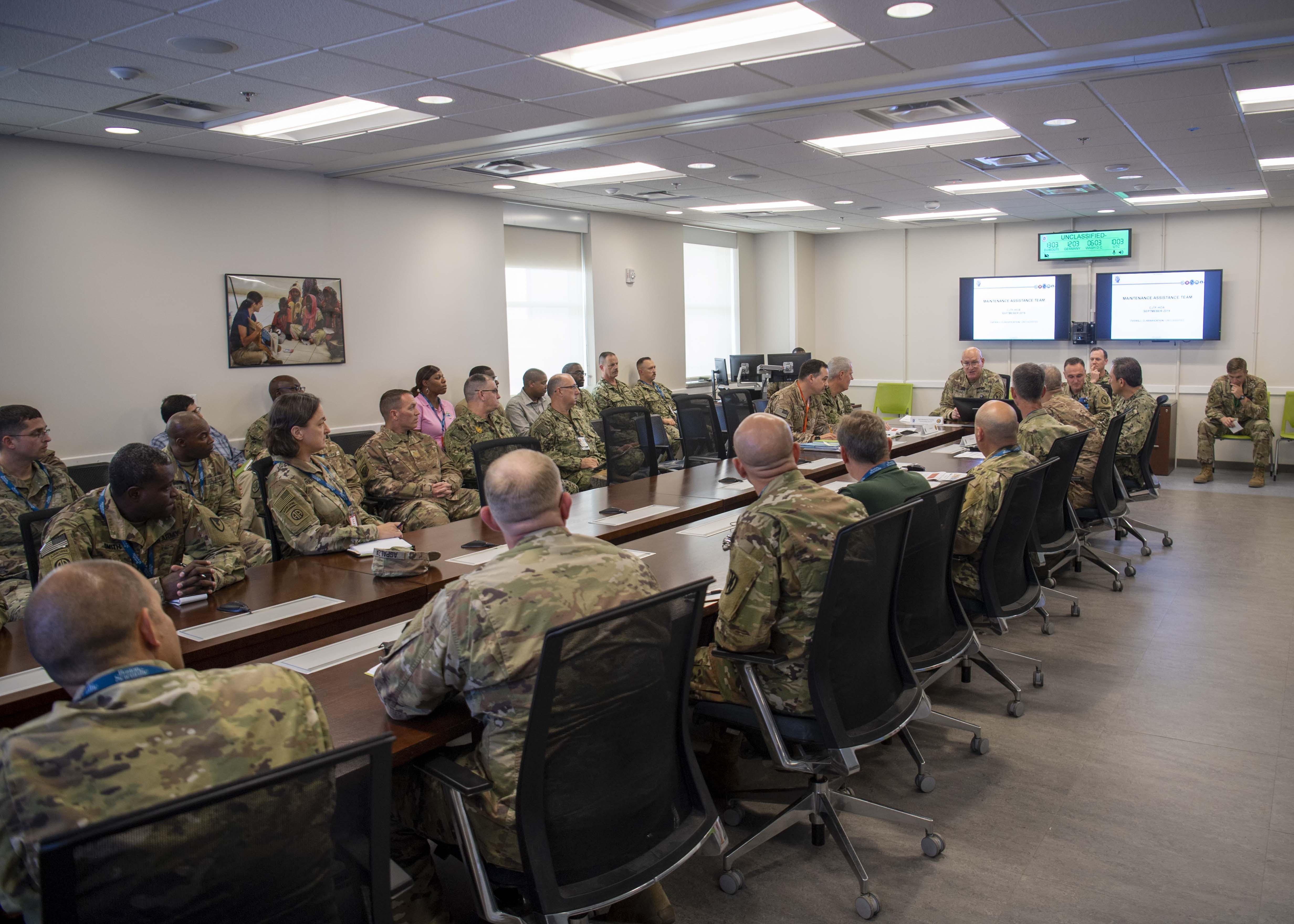 U.S. Army Maj. Gen. Michael Turello, commanding general, Combined Joint Task Force-Horn of Africa (CJTF-HOA), meets with CJTF-HOA leadership and a maintenance assistance and inspection team (MAIT) at Camp Lemonnier, Djibouti, Sept. 16, 2019. MAITs are focused on finding solutions to logistics and maintenance challenges. (U.S. Air Force photo by Staff Sgt. J.D. Strong II)
