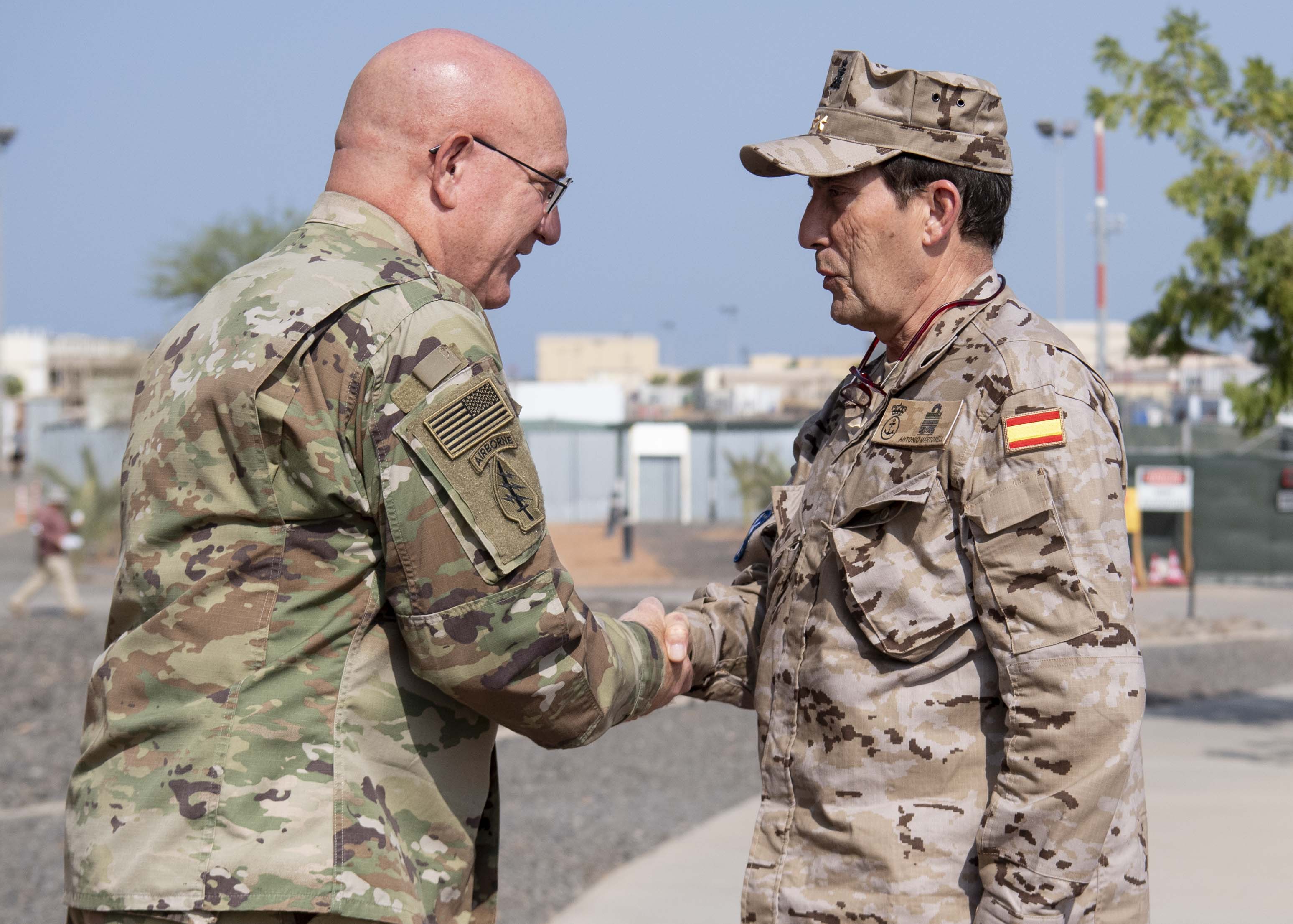 U.S. Army Maj. Gen. Michael Turello, commanding general, Combined Joint Task Force-Horn of Africa (CJTF-HOA), greets Spanish Vice Adm. Antonio Lacave, operation commander, European Union Naval Force Somalia-Operation Atalanta at Camp Lemonnier, Djibouti, Sept. 21, 2019. Lacave visited CJTF-HOA to discuss the Atalanta mission and strengthen the partnership between CJTF-HOA and Operation Atalanta. (U.S. Air Force photo by Staff Sgt. J.D. Strong II)
