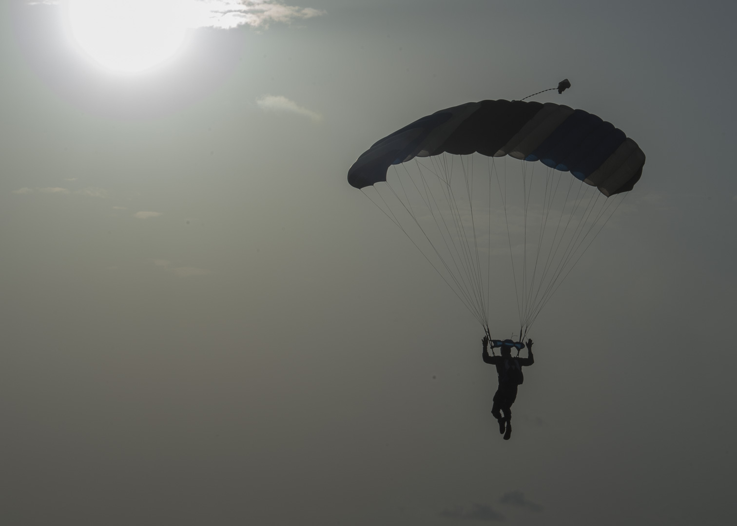 A French Forces soldier prepares to land on a drop zone after a High Altitude, Low Opening (HALO) jump outside Djibouti City, Djibouti, Sept. 29, 2019. American service members and coalition partners jumped together to celebrate the Feast Day of Archangel Michael, the patron saint of paratroopers. (U.S. Air Force Photo by Senior Airman Codie Trimble) (U.S. Air Force Photo by Senior Airman Codie Trimble)