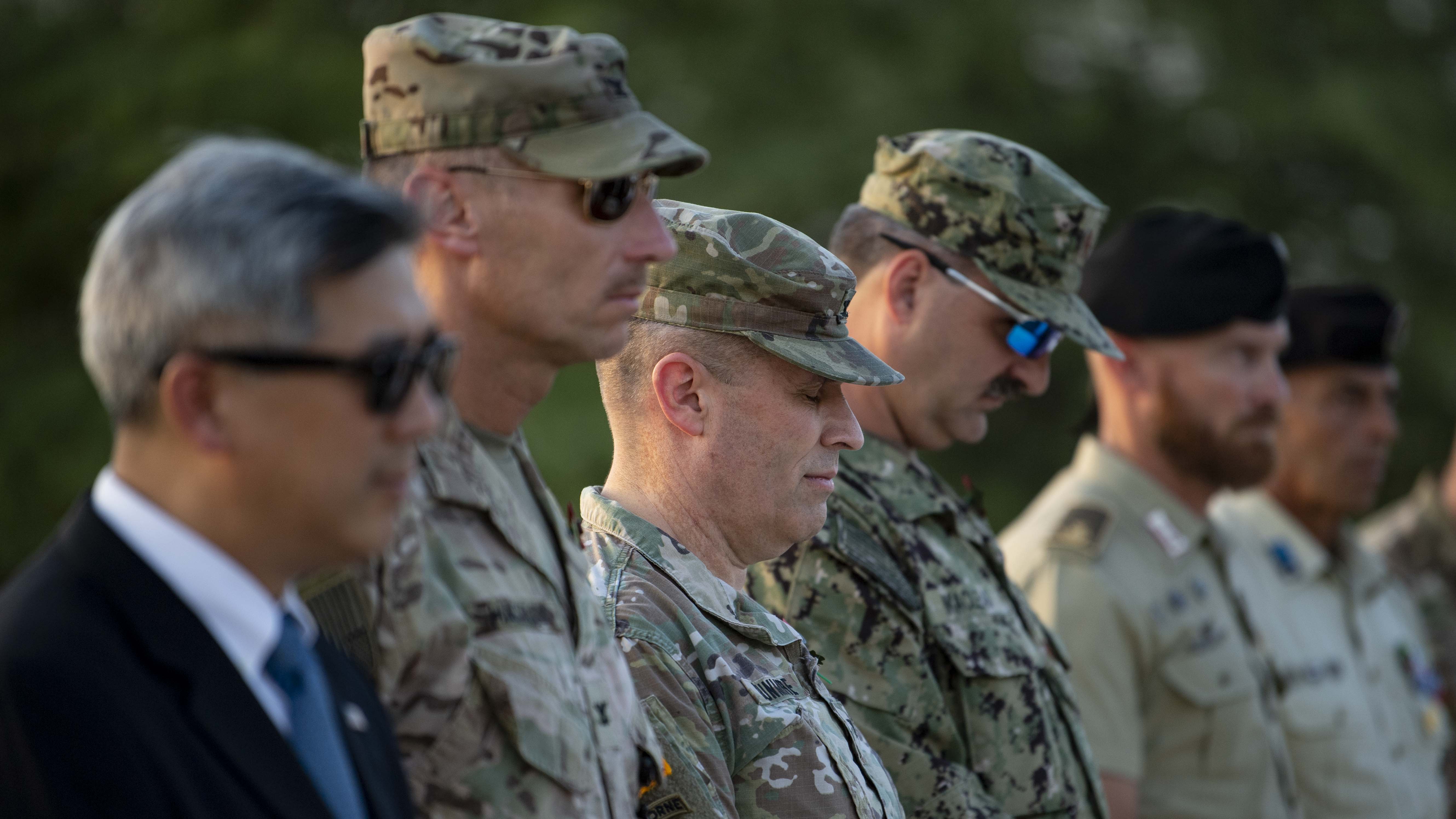 Combined Joint Task Force-Horn of Africa leadership stand for a moment of silence during a Remembrance Day service in Djibouti City, Djibouti, Nov. 13, 2019. Traditionally observed on November 11, Remembrance Day commemorates the day hostilities stopped on the western front during World War I. (U.S. Air Force photo by Staff Sgt. J.D. Strong II)
