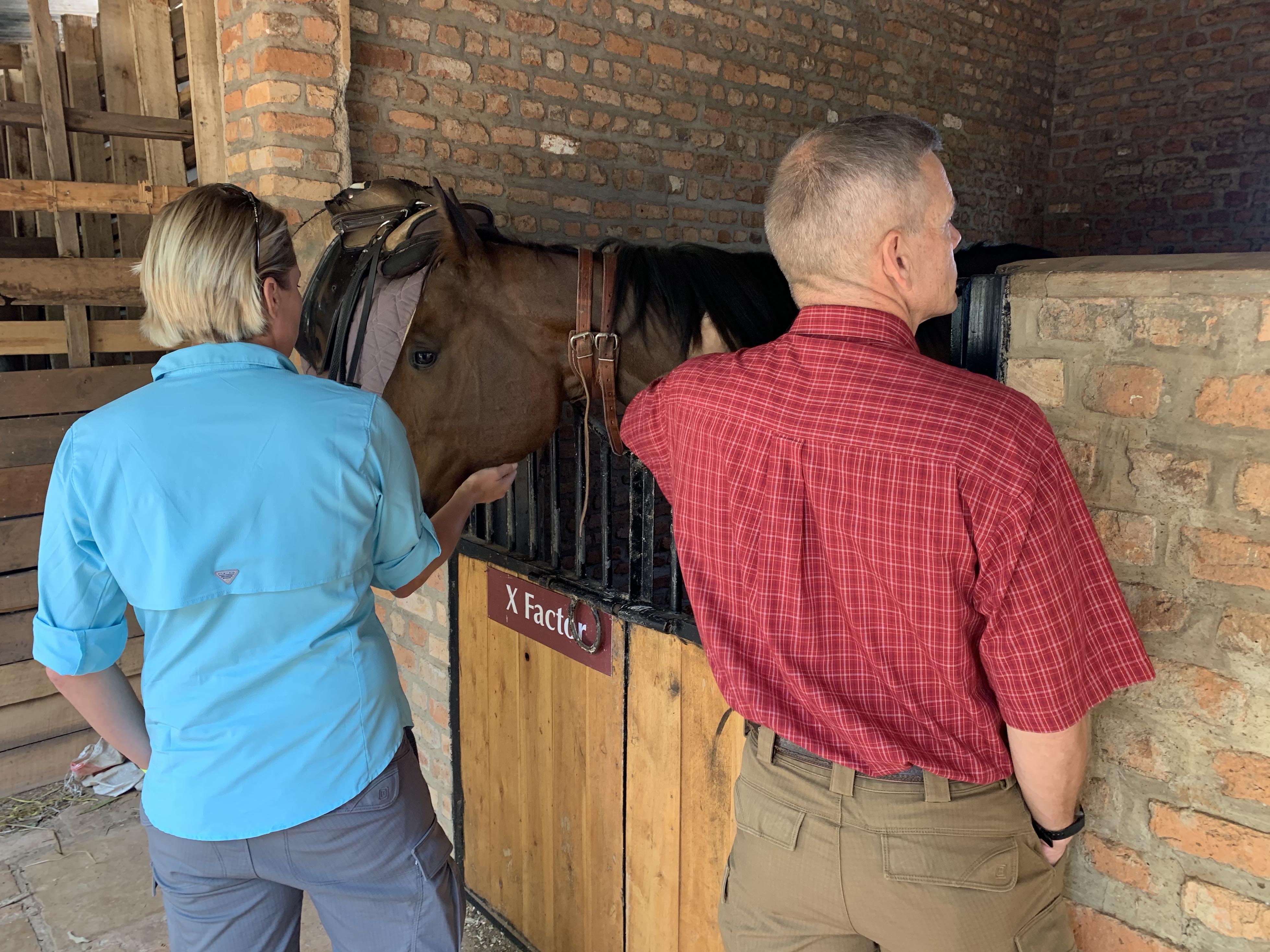 U.S. Army Maj. Stephanie Wire (left) and Lt. Col. Eugene Johnson (right), veterinarians from the 411th Civil Affairs Functional Specialty Team (CA FXST), Combined Joint Task Force-Horn of Africa (CJTF-HOA), observe a horse during a “One Health” assessment at the Fazenda Sengha horse facility, Kigali, Rwanda, Feb. 20, 2020. The CA FXST team discussed horse husbandry with trainers and inspected the horses’ living conditions during the assessment. (U.S. Air Force photo by Tech. Sgt. Ashley Nicole Taylor)