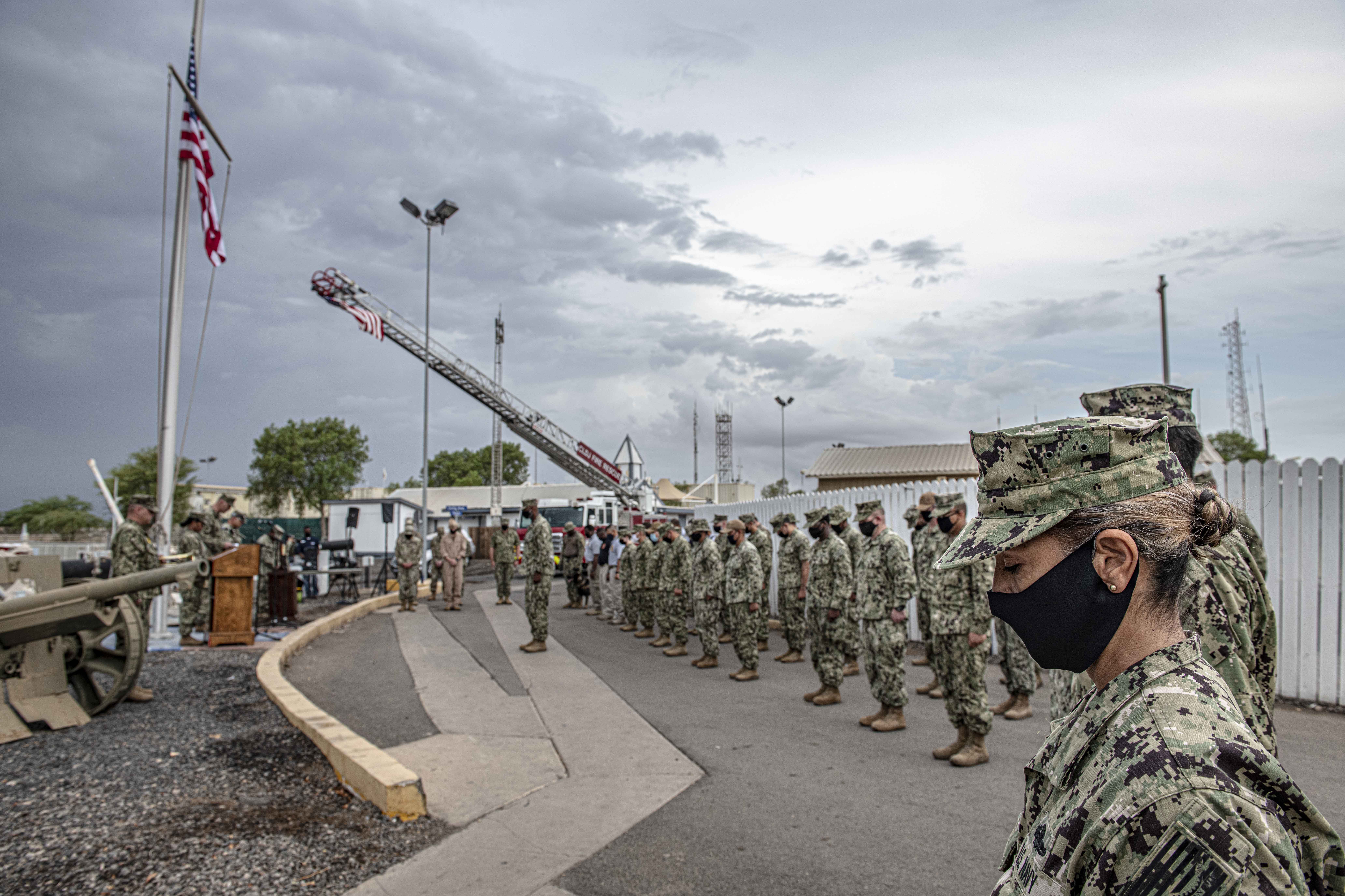 U.S. service members assigned to Combined Joint Task Force - Horn of Africa (CJTF-HOA) and Camp Lemonnier, Djibouti (CLDJ) bow their heads for the invocation during a 9/11 Remembrance Ceremony organized by the Chief Petty Officers Association at CLDJ, Sept. 11, 2020. (U.S. Navy photo by Chief Mass Communication Specialist Elisandro T. Diaz)