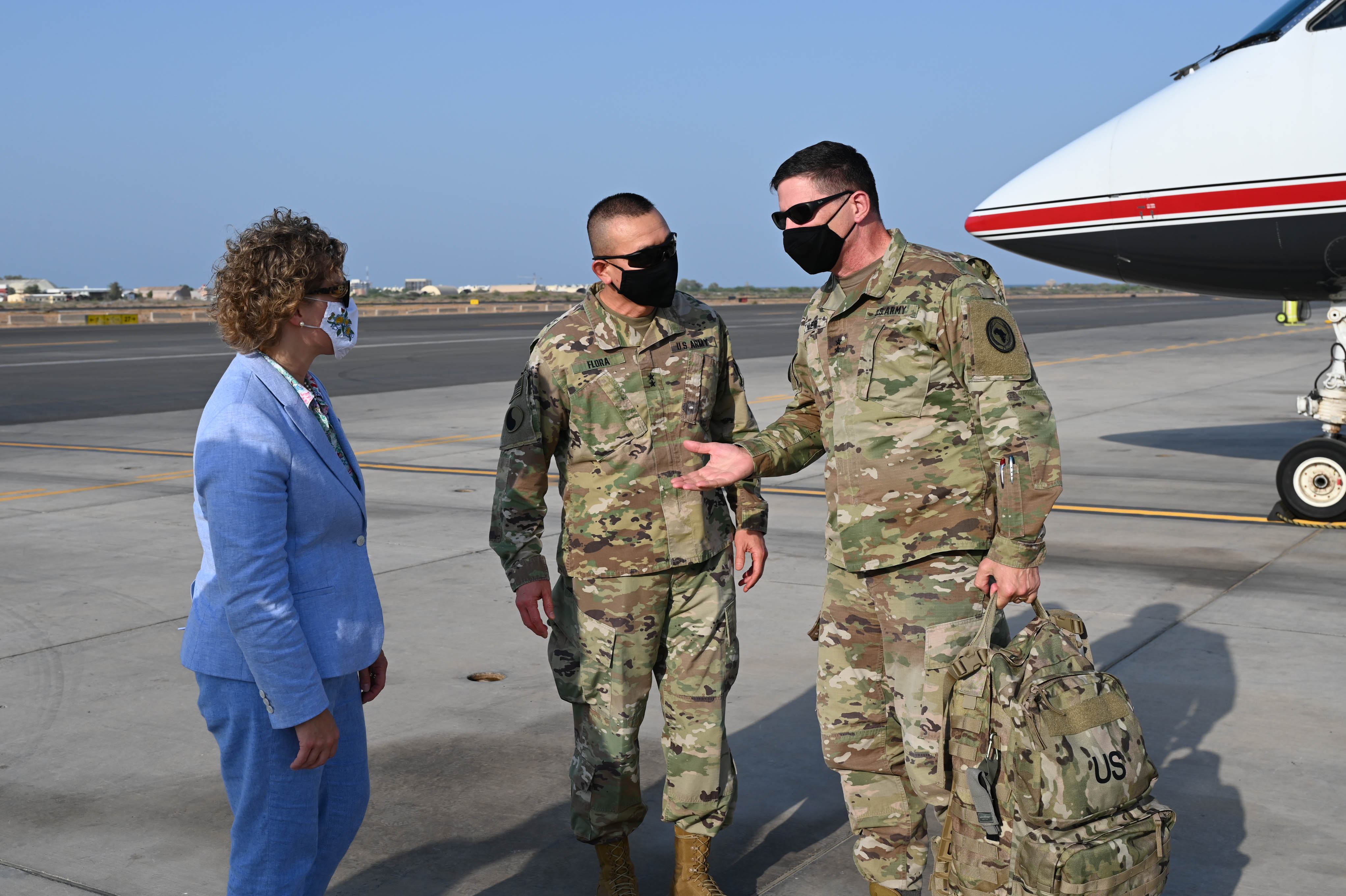 Andrea Tomaszewicz, U.S. Embassy Djibouti Deputy Chief of Mission and U.S. Army Maj. Gen. Lapthe C. Flora, commanding general, Combined Joint Task Force-Horn of Africa (CJTF-HOA), greet U.S. Army Maj. Gen. Joel K. Tyler, J-3 operations and cyber director, U.S. Arica Command, after arriving at Camp Lemonnier, Djibouti, Sept. 27, 2020. Tyler visited East Africa to assess U.S. operations, force protection, and posture location support. (U.S. Air Force photo by Staff Sgt. Dana J. Cable)