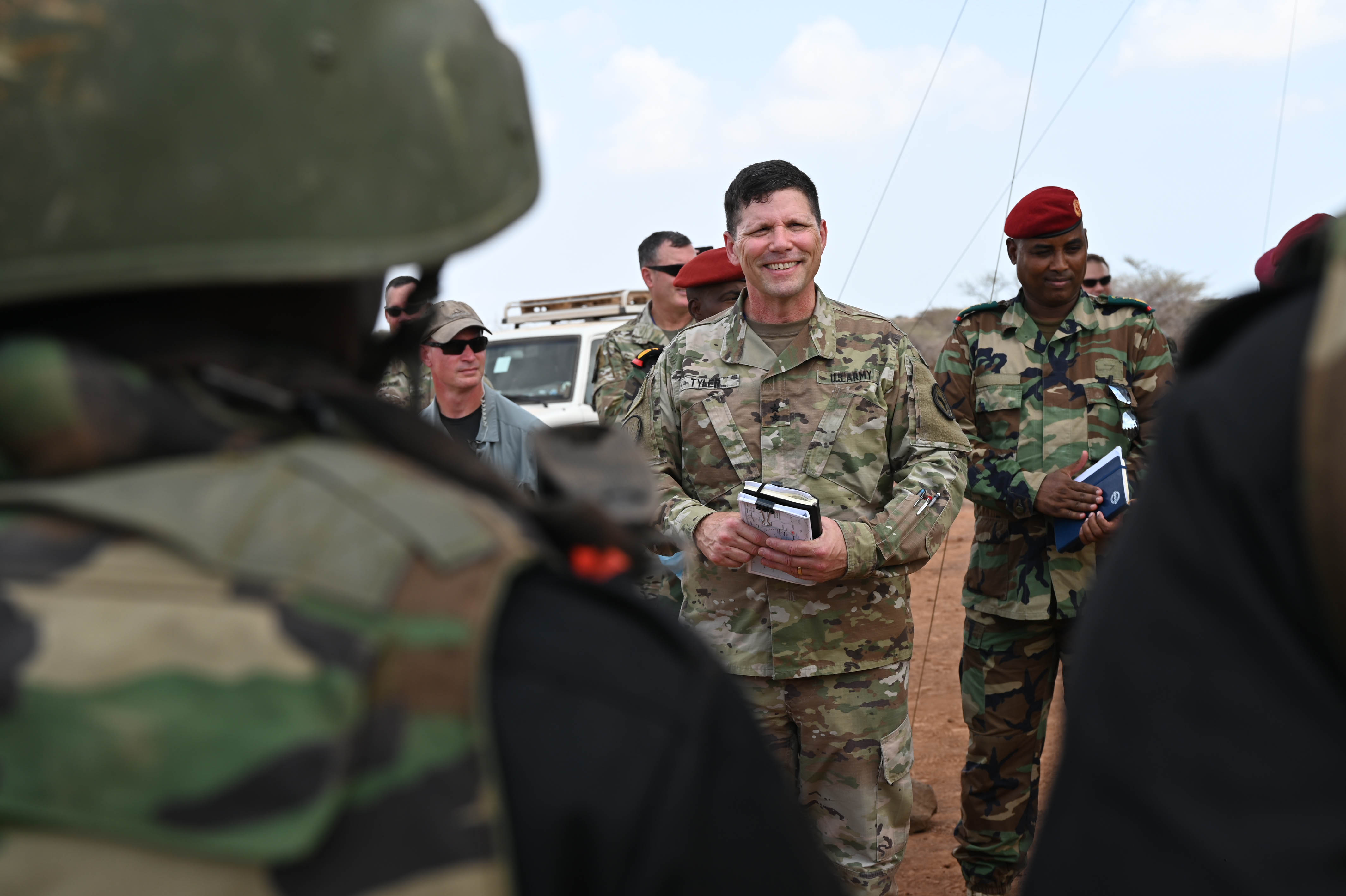 U.S. Army Maj. Gen. Joel K. Tyler, J-3 operations and cyber director, speaks with soldiers from the Djiboutian National Army’s Rapid Intervention Battalion (RIB) after watching a live-fire exercise Sept. 28, 2020. The RIB’s mission is to serve as a reactionary force to accomplish specific tasks directed by their higher command in the Djiboutian army. (U.S. Air Force photo by Staff Sgt. Dana J. Cable)