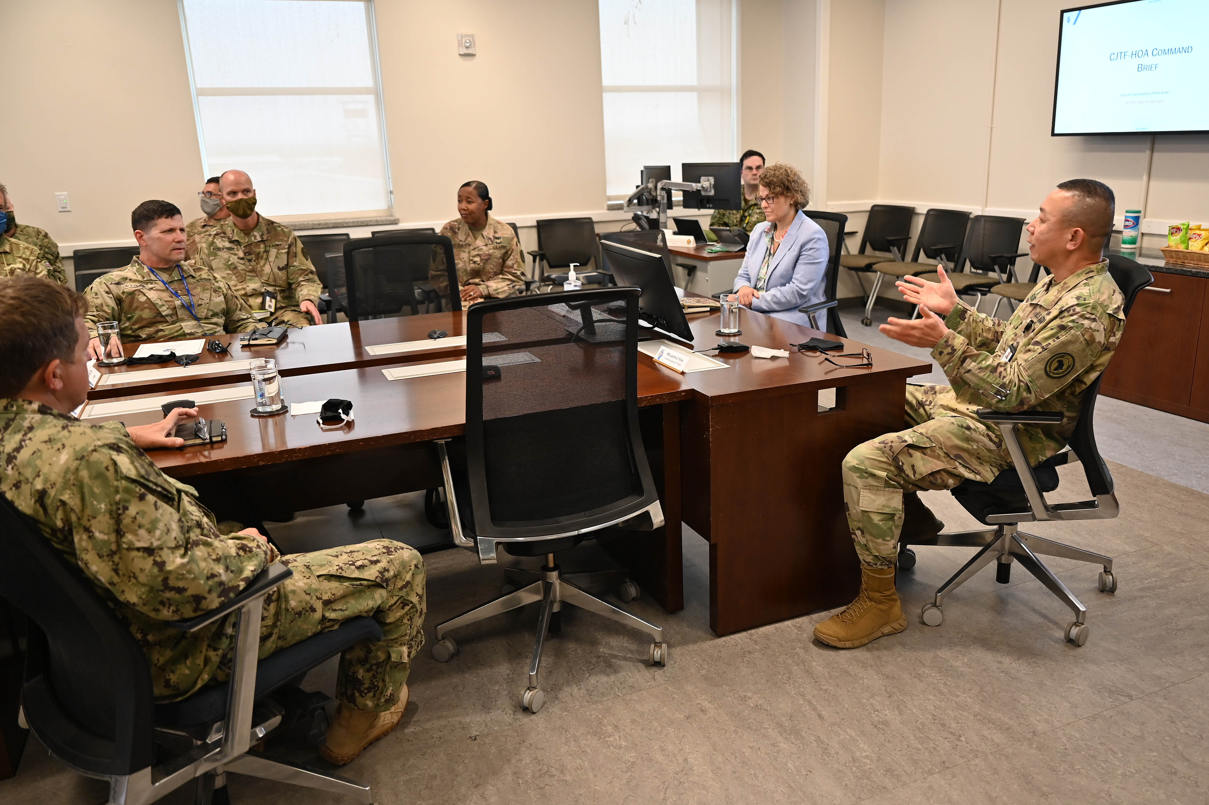 Andrea Tomaszewicz, U.S. Embassy Djibouti Deputy Chief of Mission and U.S. Army Maj. Gen. Lapthe C. Flora, commanding general, Combined Joint Task Force-Horn of Africa (CJTF-HOA), provide a CJTF-HOA mission brief to U.S. Army Maj. Gen. Joel K. Tyler, J-3 operations and cyber director, U.S. Arica Command, after arriving at Camp Lemonnier, Djibouti, Sept. 27, 2020. Tyler visited East Africa to assess U.S. operations, force protection, and posture location support. (U.S. Air Force photo by Staff Sgt. Dana J. Cable)