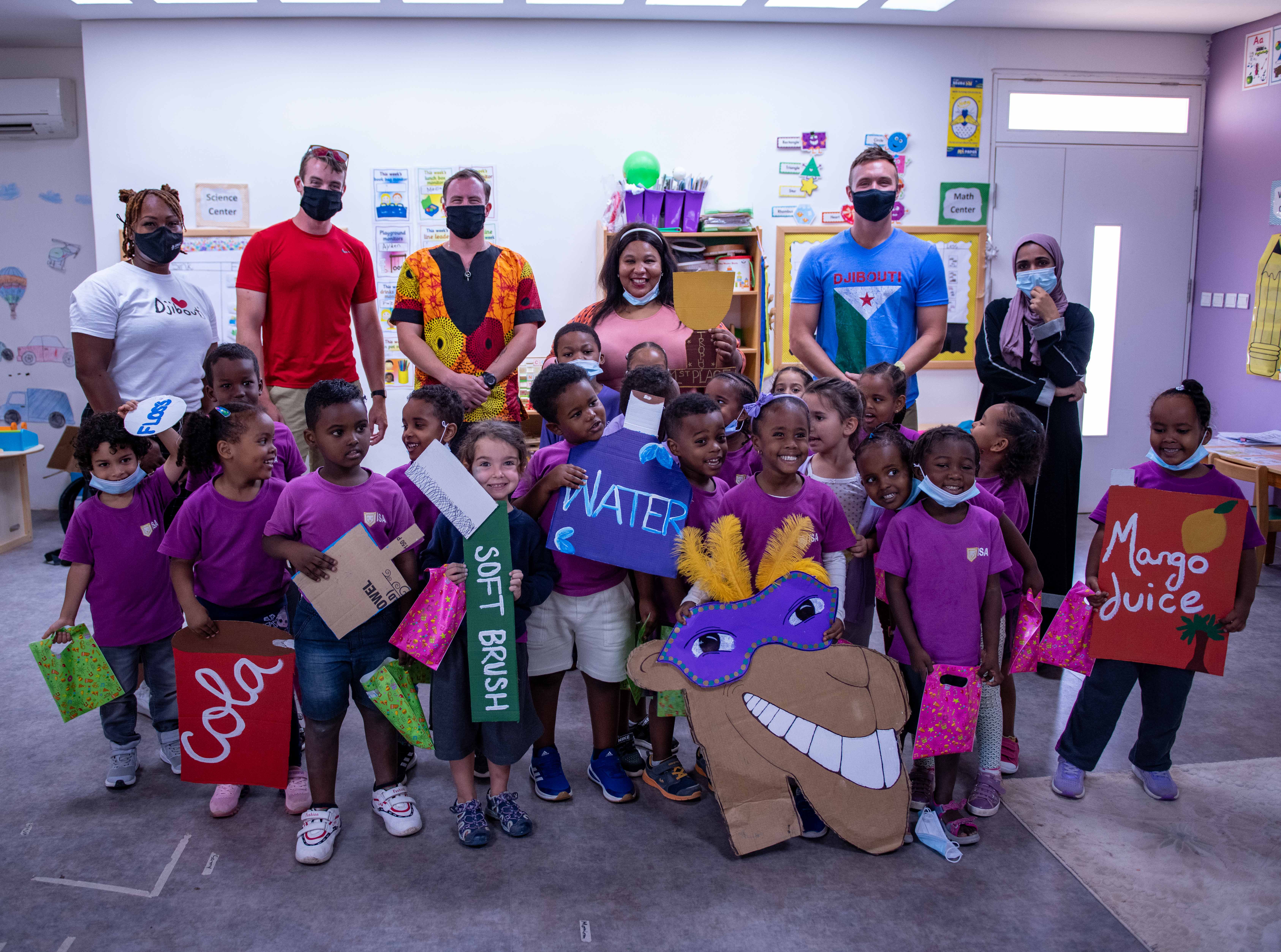 U.S. Army Civil Affairs East Africa Southern European Task Force Africa (CA-EA SETAF-AF) functional specialty team members and students pose for a group photo at the International School of Africa, Arta, Djibouti, March 23, 2021. Members of the CA-EA SETAF-AF team collectively spoke to more than 70 children at the school, reinforcing the focus on preventative oral health care. (U.S. Air Force photo by Senior Airman Morgan L. Brown)
