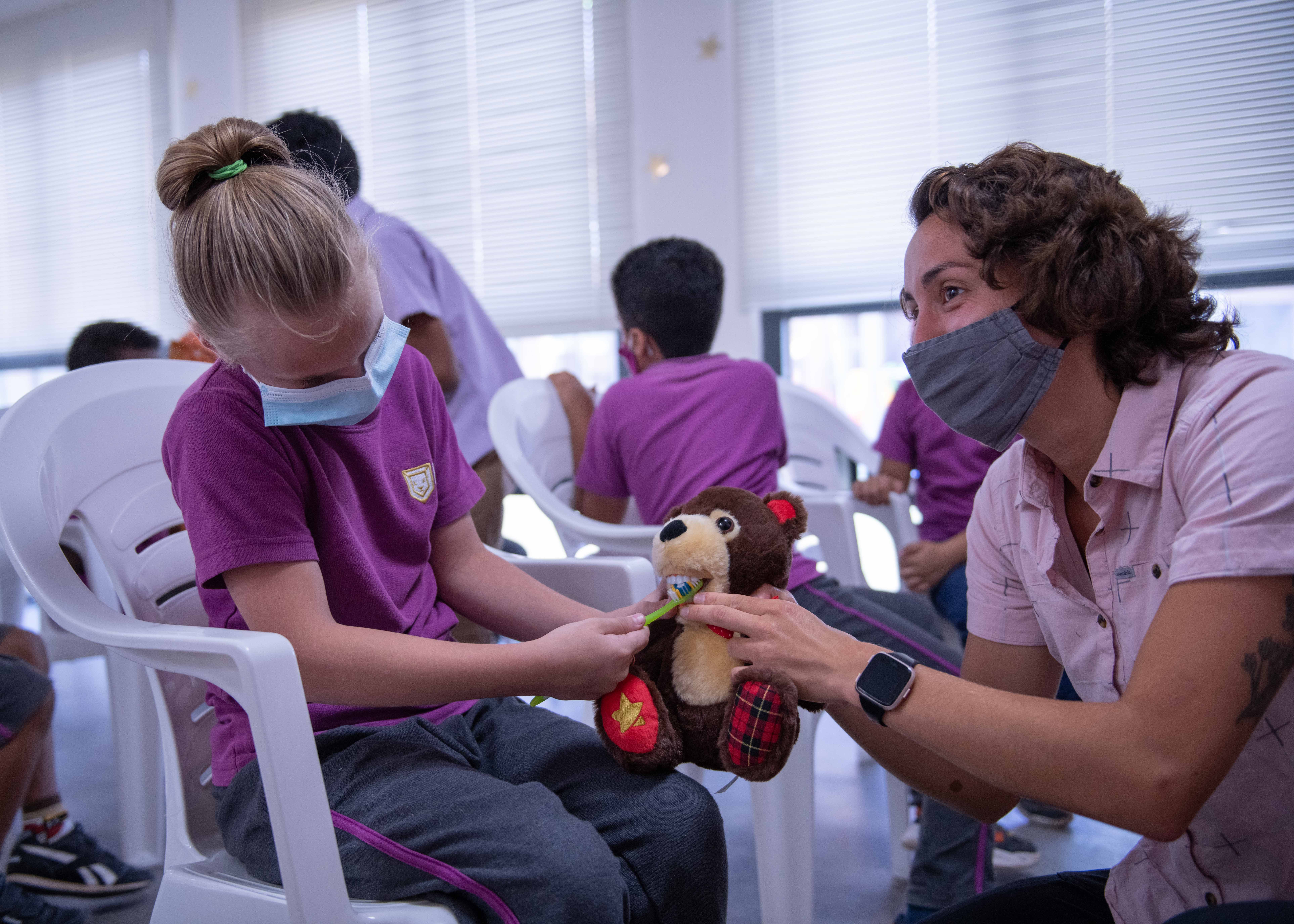 A child shows U.S. Army Cpl. Hannah Sivak, a medic assigned to Civil Affairs East Africa Southern European Task Force Africa (CA-EA SETAF-AF) functional specialty team in support of Combined Joint Task Force-Horn of Africa (CJTF-HOA), how she brushes teeth on a toy bear during an oral health class at the International School of Africa, Arta, Djibouti, March 23, 2021. The CA-EA SETAF-AF team is composed of dentists, veterinarians, medics, and other medical specialties, giving them the unique capability to deliver and share educational and clinical expertise throughout the Horn of Africa. (U.S. Air Force photo by Senior Airman Morgan L. Brown)