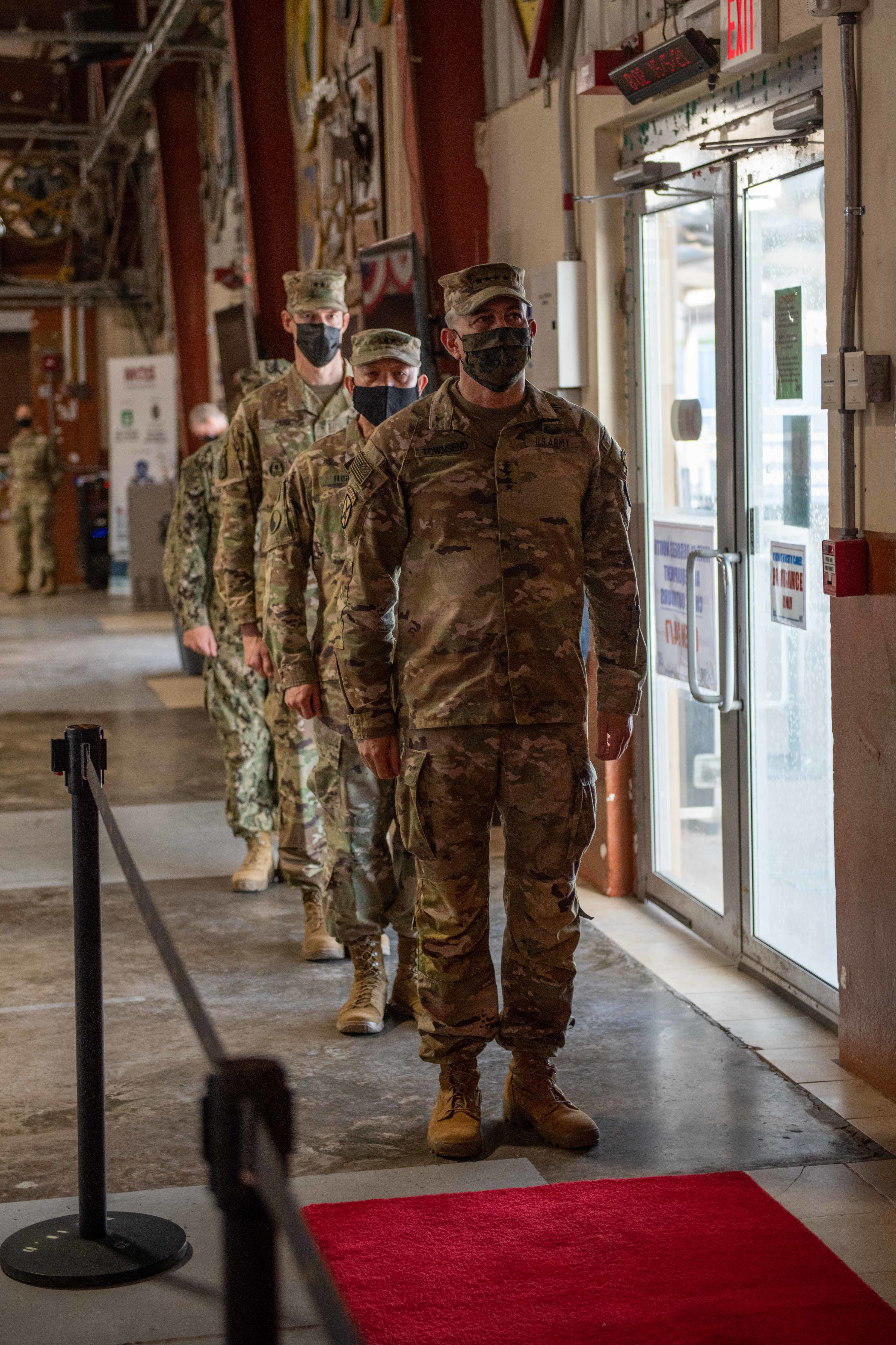 U.S. Army Gen. Stephen J. Townsend (front), commander of United States Africa Command (USAFRICOM), U.S. Army Maj. Gen. Lapthe C. Flora (middle), outgoing commander of Combined Joint Task Force-Horn of Africa (CJTF-HOA), and Maj. Gen. William Zana (end), incoming commander of CJTF-HOA, prepare for the start of a change of command ceremony at Camp Lemonnier, Djibouti, May 15, 2021. Zana is familiar with the CJTF-HOA mission as this is his second time at the command. (U.S. Air Force photo by Senior Airman Morgan L. Brown)