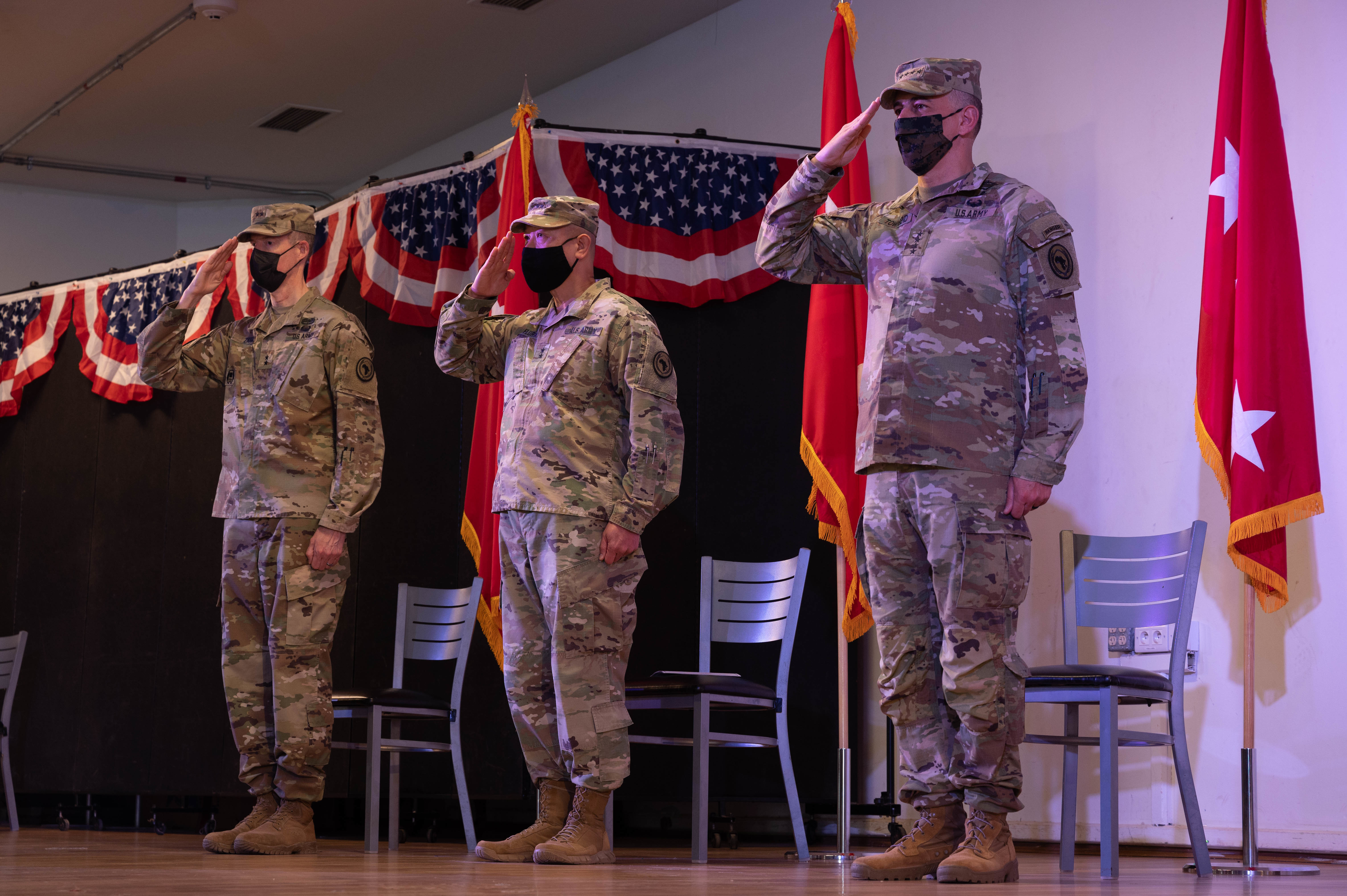 U.S. Army Maj. Gen. William L. Zana (left), incoming commander of Combined Joint Task Force-Horn of Africa (CJTF-HOA), U.S. Army Maj. Gen. Lapthe C. Flora (middle), outgoing commander of CJTF-HOA, and U.S. Army Gen. Stephen J. Townsend (right), commander of U.S. Africa Command (USAFRICOM), salute during the playing of Ruffles and Flourishes during a change of command ceremony, May 15, 2021, at Camp Lemonnier, Djibouti. Zana previously served as the Joint Staff J5, Deputy Director of Africa. (U.S. Air Force photo by Master Sergeant Grady Epperly)
