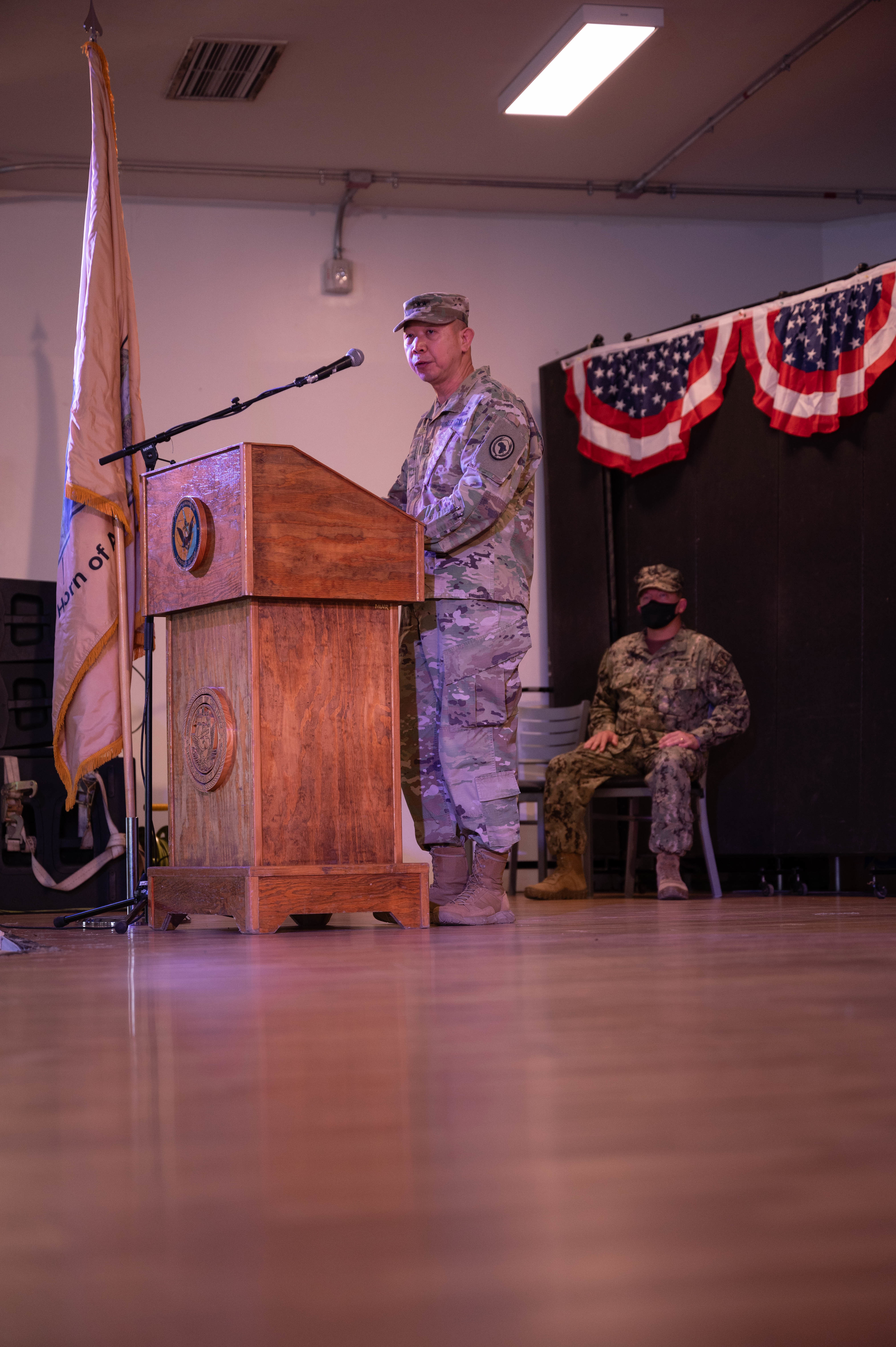 U.S. Army Maj. Gen. Lapthe C. Flora, outgoing commander of Combined Joint Task Force – Horn of Africa (CJTF-HOA), speaks to the audience during his change of command ceremony at Camp Lemonnier, Djibouti, May 15, 2021. Flora thanked his command staff, distinguished visitors and CJTF-HOA teammates for a rewarding experience. (U.S. Air Force photo by Master Sergeant Grady Epperly)