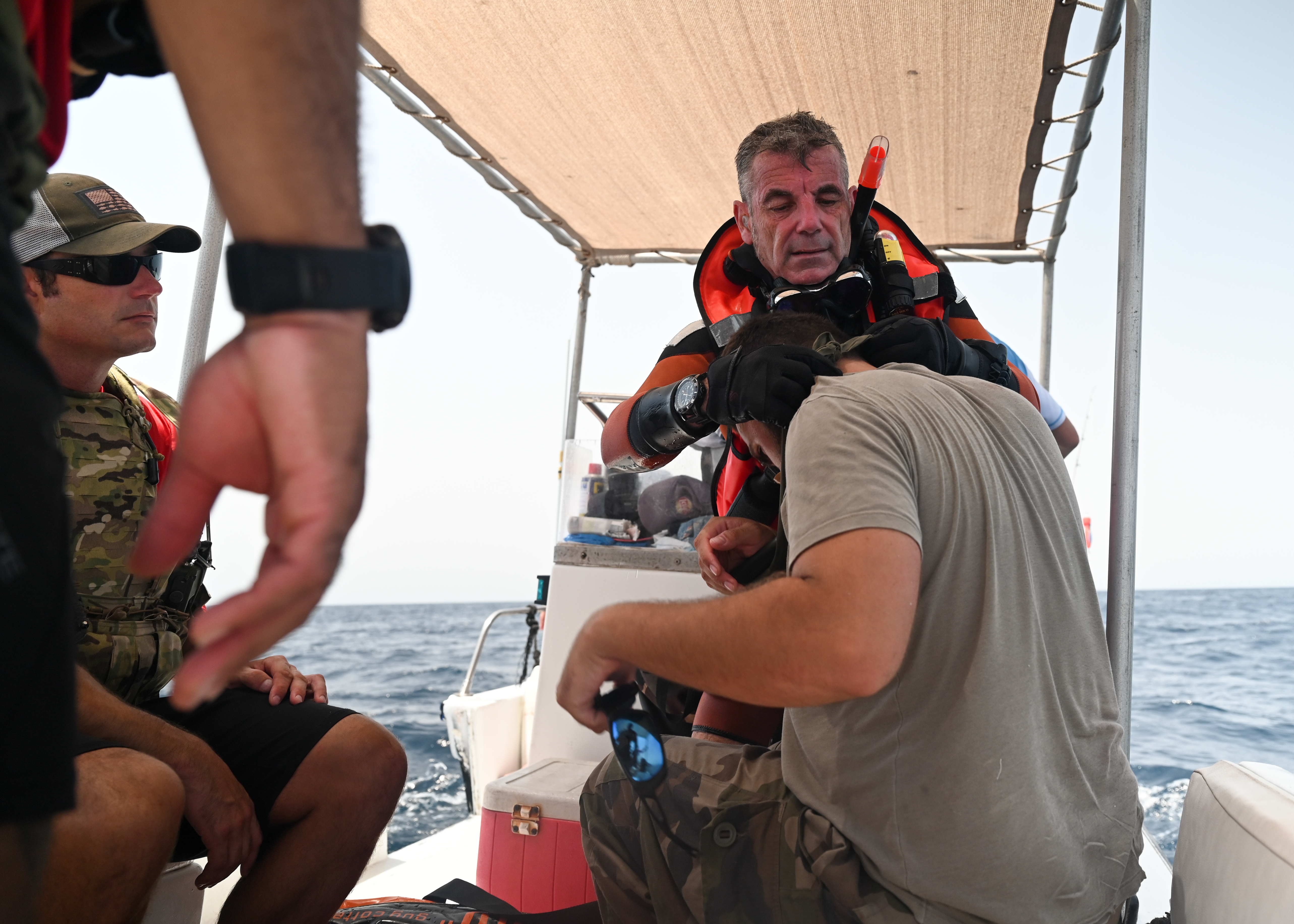 A French Air Force rescue diver assists a simulated patient into a sling during a joint water rescue training in the Gulf of Tadjoura June 30, 2021. U.S. and French forces responded to a simulated anti-piracy scenario, honing maritime rescue procedures and enhancing partner capabilities. (U.S. Air Force photo by Staff Sgt. Missy Sterling)