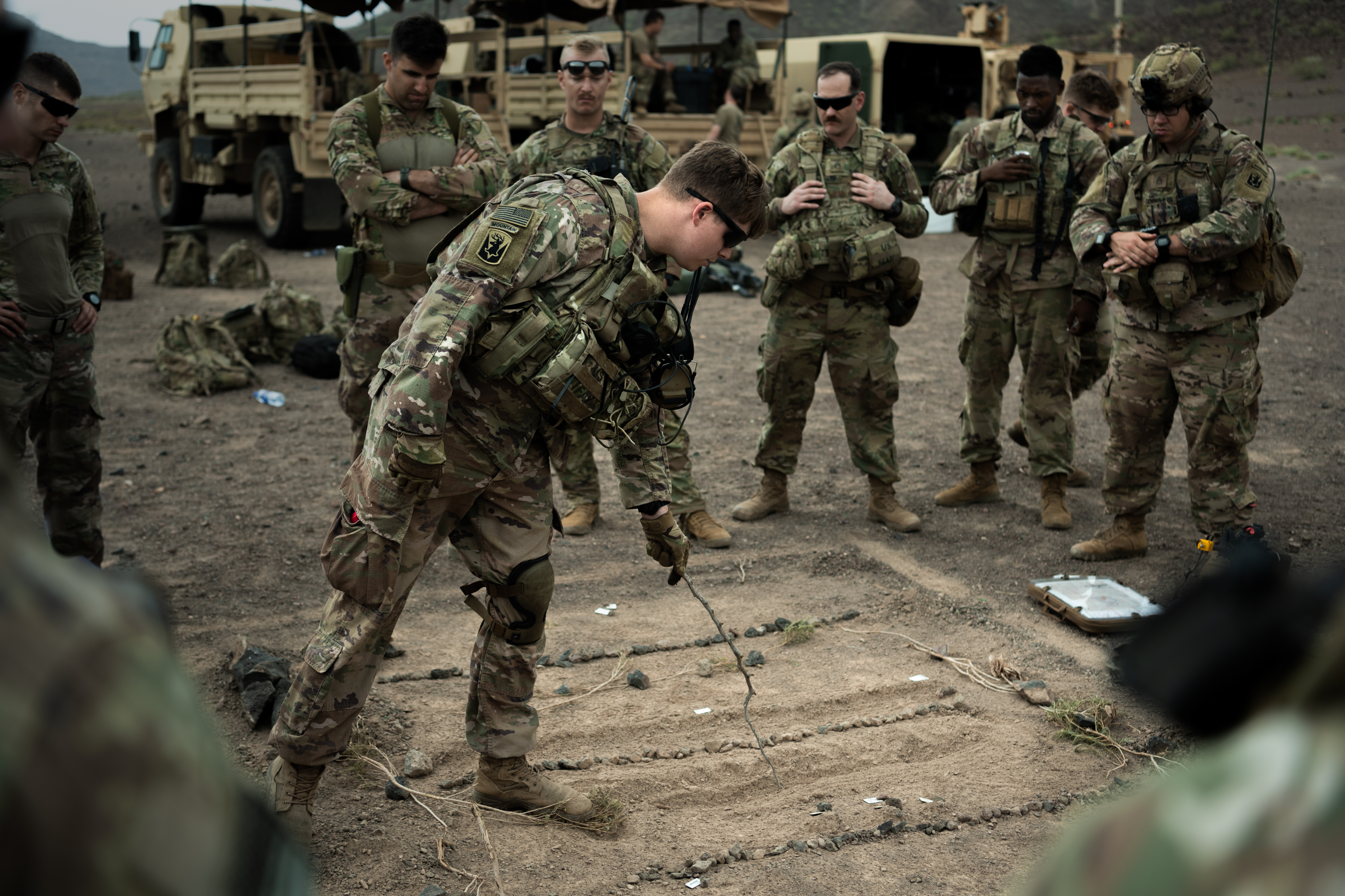 U.S. Army 2nd Lt. Tyler Laplante, platoon leader, Task Force Iron Gray, Combined Joint Task Force – Horn of Africa (CJTF-HOA), conducts a sand table mission brief for a live-fire exercise at the Djiboutian Range Complex, Djibouti, Aug. 24, 2021. Live-fire exercises validate a platoon’s proficiency to take command and control through reinforcing concepts like supporting fire, base of fire and synchronization of fires.