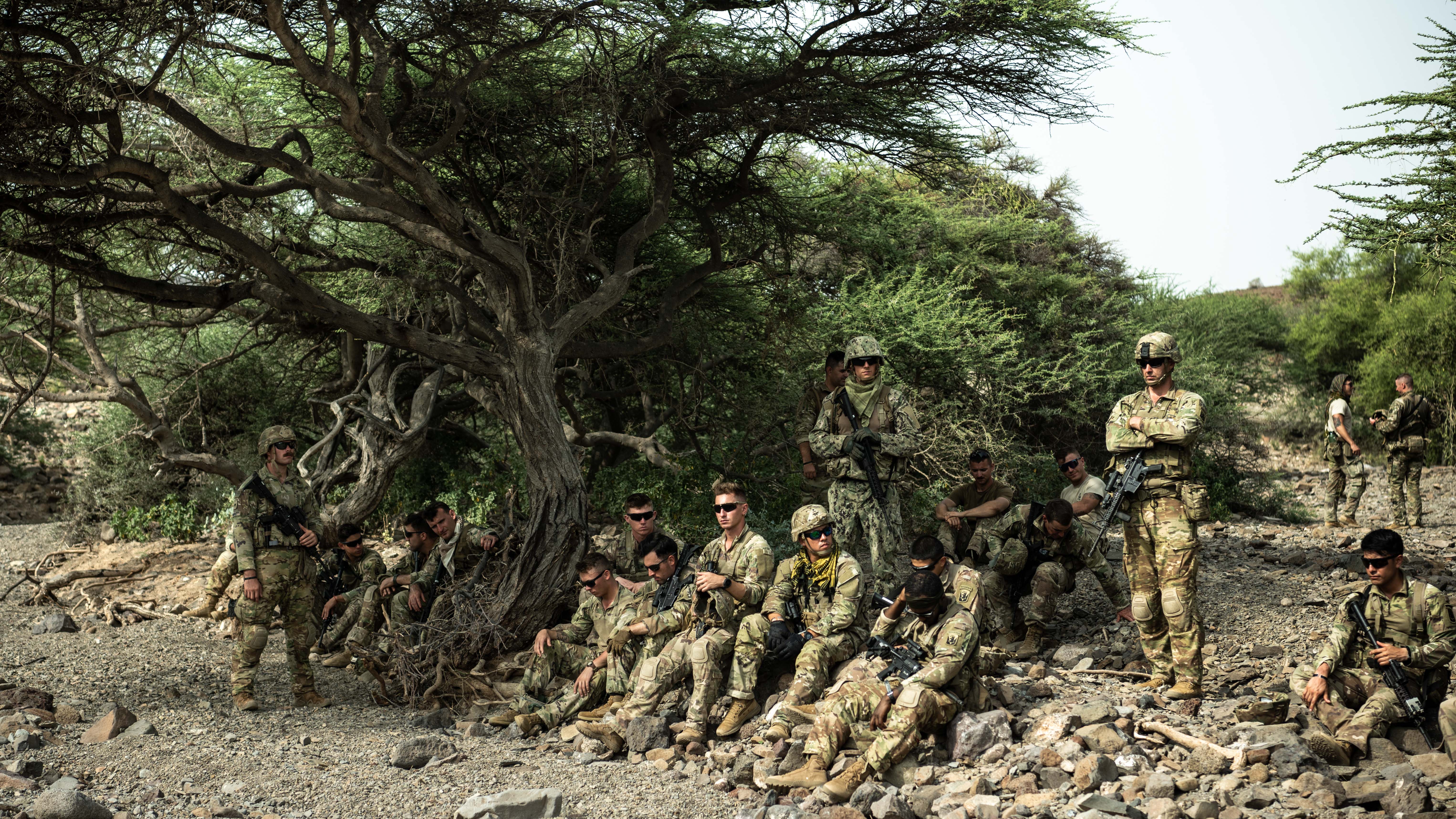 U.S. service members, Combined Joint Task Force-Horn of Africa, rest under a tree during an overnight field training exercise that covers 15 kilometers of marching at the Djiboutian Range Complex, Djibouti, Aug. 28-29, 2021. The exercise prepares service members for the French Desert Commando Course (FDCC) scheduled for mid-September. The course consists of knot tying, mountain confidence, basic infantry skills and night operations. The French Army invites a select number of U.S. service members to participate in the course where participants compete to earn the FDCC qualification badge upon successful completion of the course. (U.S. Air Force photo by Senior Airman Andrew Kobialka)