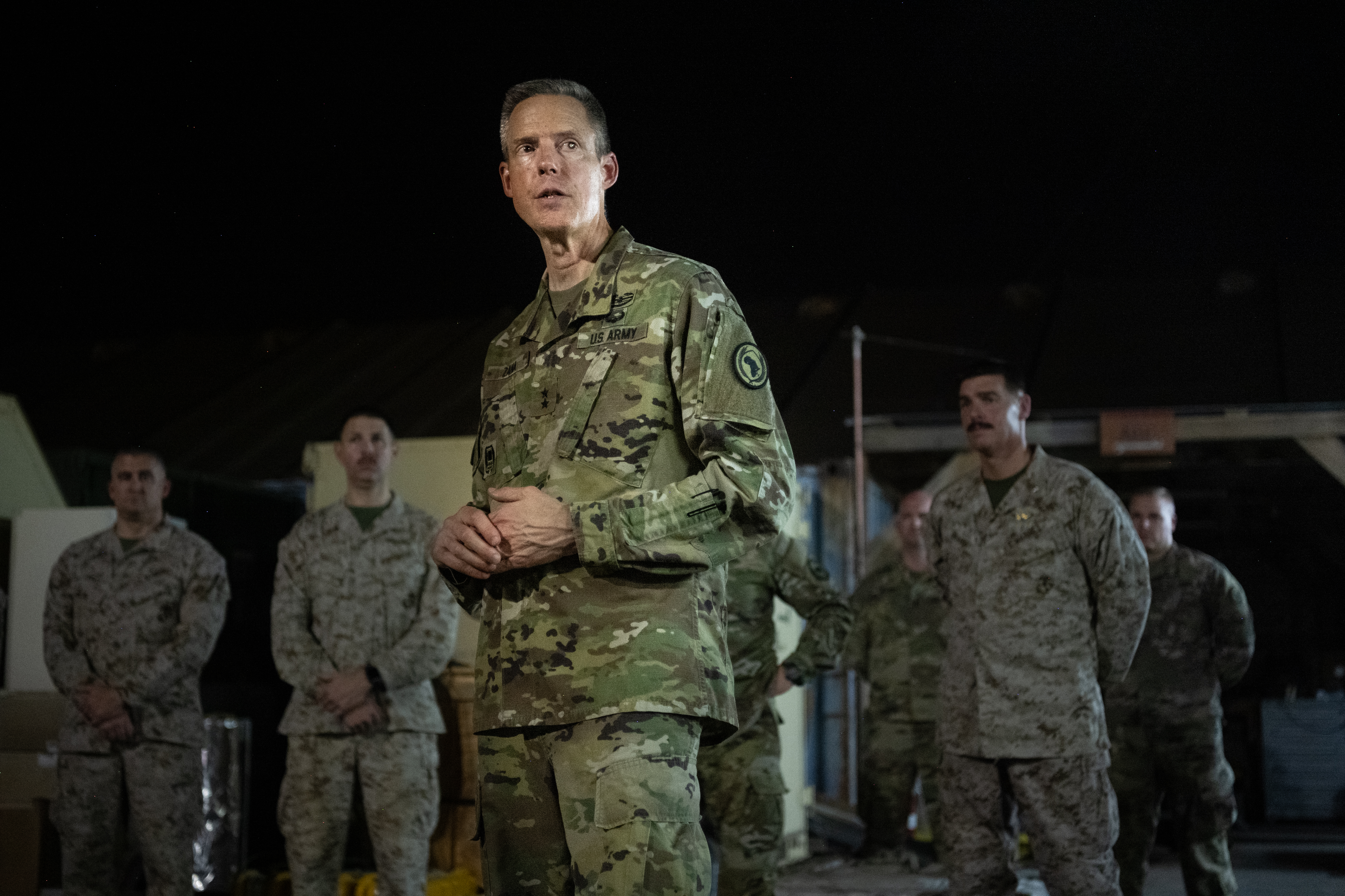Maj. Gen. Williiam Zana, Commanding General, Combined Joint Task Force - Horn of Africa, thanks U.S. Marines assigned to the Marine Aerial Refueler Transport Squadron - 234, for their hardwork at Camp Lemonnier, Djibouti, August 12, 2021. Camp Lemonnier enables U.S., allied and partner nation forces to support operational and crisis response missions in Europe, Africa and Southwest Asia. (U.S. Air Force photo by Senior Airman Andrew Kobialka)