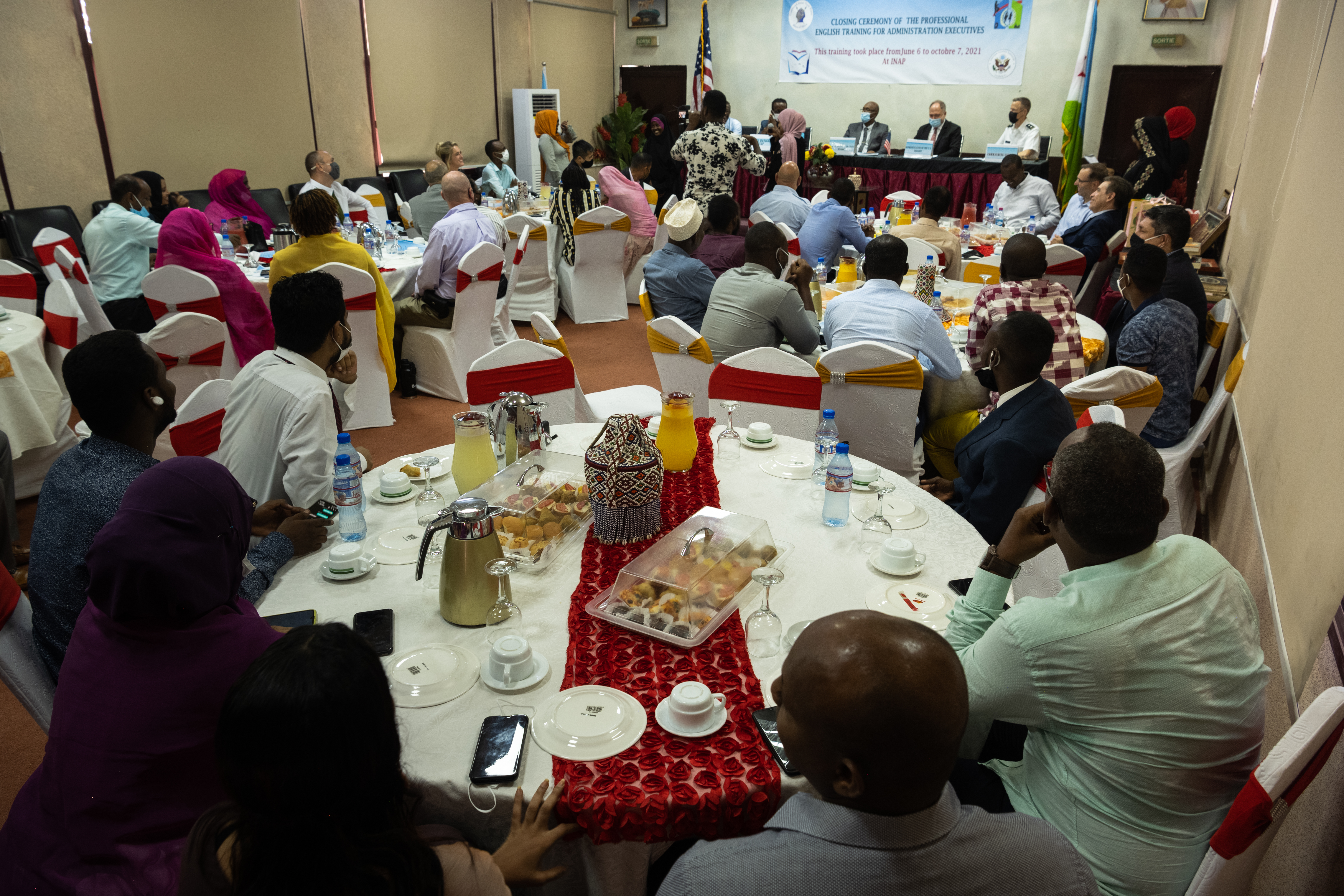 The Combined Joint Task Force-Horn of Africa commanding general, Djibouti Minister of Labor, and a representative from the U.S. Embassy join participants and facilitators of the 3-month U.S.-led English Discussion Group at the National Institute of Public Administration training center in Djibouti City, Djibouti, Oct. 13, 2021. Twenty-five Djiboutians completed the course which aimed to increase the participants' confidence and competency in the English language to further business opportunities for all of Djibouti. (U.S. Air Force photo by Senior Airman Andrew Kobialka)