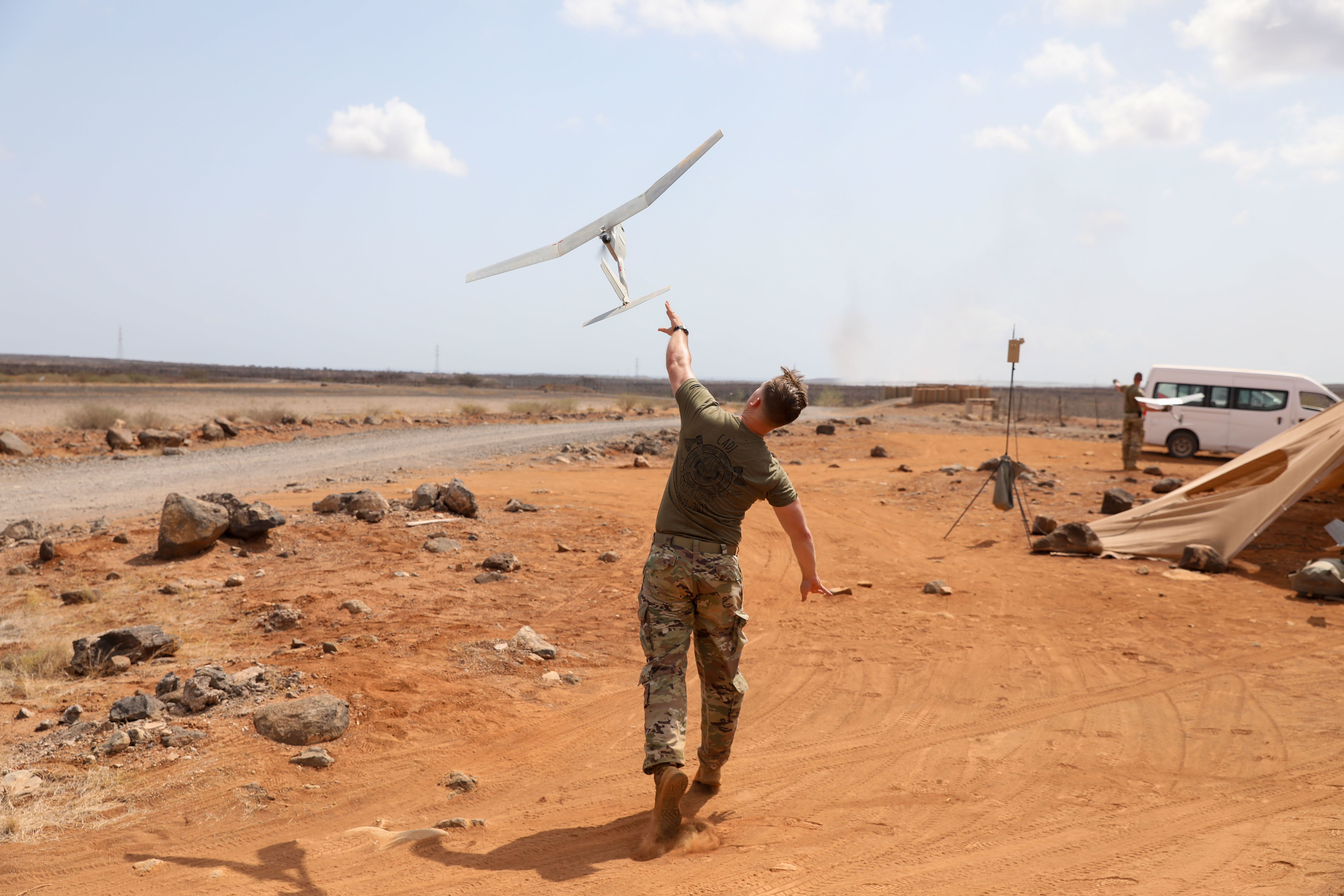 U.S. Army Spc. William Ellison, security forces, B Company, 1-157th Infantry (Mountain), Combined Joint Task Force – Horn of Africa (CJTF-HOA), launches a RQ-11 Raven unmanned aerial vehicle during an operators course at Chabelley Airfield, Djibouti, Oct. 13, 2021. The course instructed Soldiers on how to operate and maintain the small hand-launched remote-controlled aircraft system. The Raven is a UAV system employed by CJTF-HOA for intelligence, surveillance and reconnaissance. (U.S. Army National Guard photo by Pfc. Gauret Stearns)