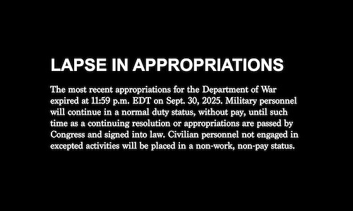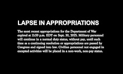 The most recent appropriations for the Department of War expired at 11:59 p.m. EDT on Sept. 30, 2025. Military personnel will continue in a normal duty status, without pay, until such time as a continuing resolution or appropriations are passed by Congress and signed into law. Civilian personnel not engaged in excepted activities will be placed in a non-work, non-pay status.